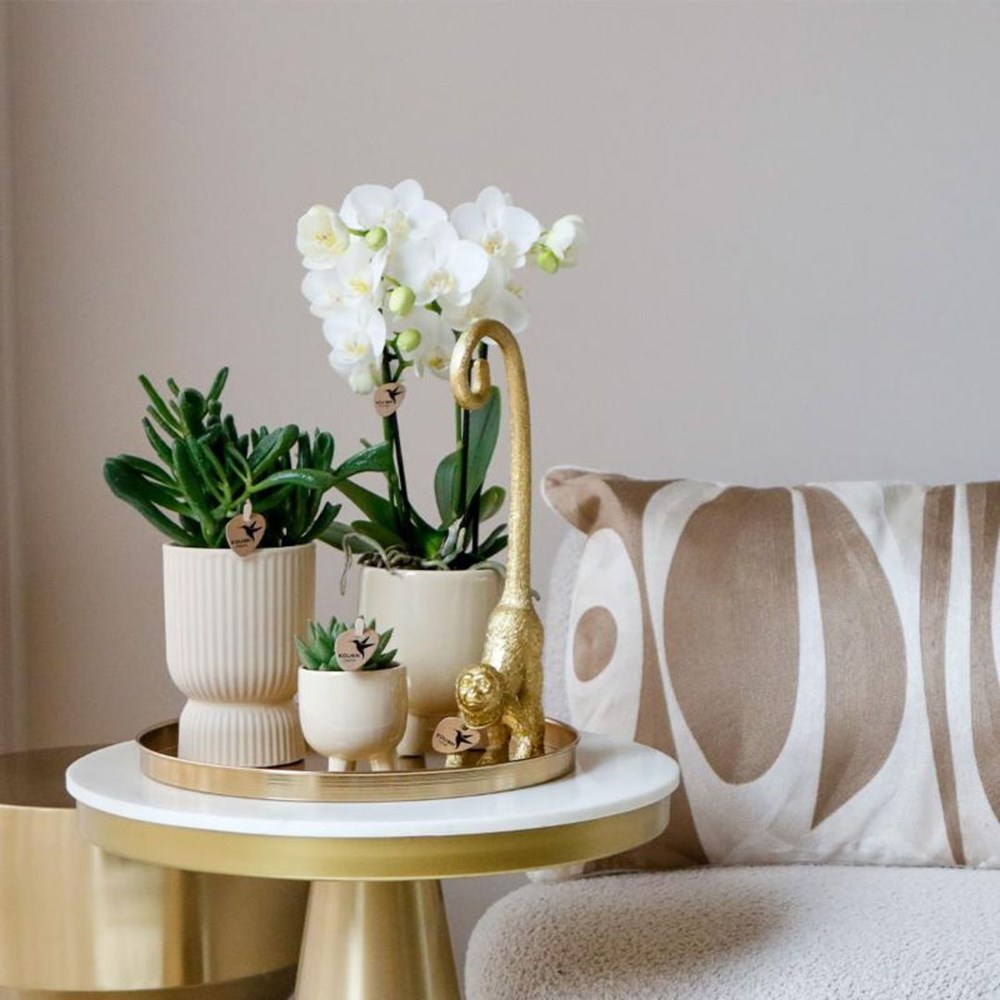 Entfliehen Sie den Standardgeschenken und entscheiden Sie sich für ein einzigartiges grünes Geschenk, das sowohl Wachstum als auch Blüte umfasst. Das Botanical Giftset large bietet eine umfassende und luxuriöse Erfahrung botanischer Schönheit und Stil. Dieses Set besteht aus einer stilvollen Schale, die die Basis dieses Sets bildet. Auf der Schale steht eine wunderschöne Orchidee in einem Keramiktopf, die in einer transparenten Schutzhülle geliefert wird, um sie zu schützen. Darüber hinaus enthält die Schale eine große grüne Pflanze in einem Keramiktopf und eine kleine grüne Pflanze, oft eine Rhipsalis oder Sukkulente, in einem Keramiktopf. Darüber hinaus ist das Set mit einem passenden Ornament oder einer Figur ausgestattet, die zur Variante passt, und alles ist sorgfältig in einer schönen Geschenkbox verpackt. All dies kommt direkt aus der Gärtnerei, sodass Sie frische und qualitativ hochwertige Pflanzen erhalten.