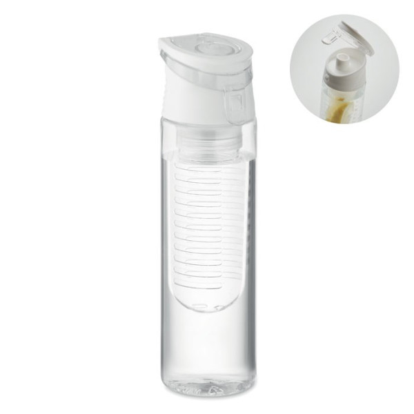 Trinkflasche aus RPET mit entnehmbarem Frucht-Aromafach. Henkel und auslaufsicherer Deckel. Füllmenge: 500 ml.