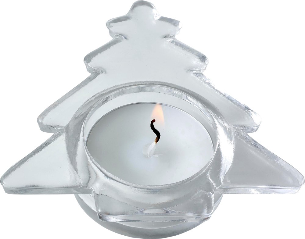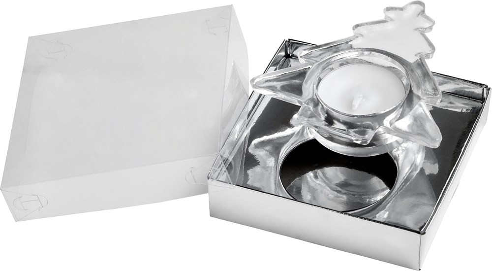 Teelichthalter 'X-MAS Tree' aus Glas im Tannenbaum-Design, inklusive Teelicht, verpackt in einer farbigen Geschenkbox mit Klarsichtdeckel und Schleife.