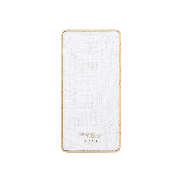 Externer Zusatzakku mit 8.000 mAh. Gehäuse aus einer Kombination aus Bio-Hanf und Naturholz.