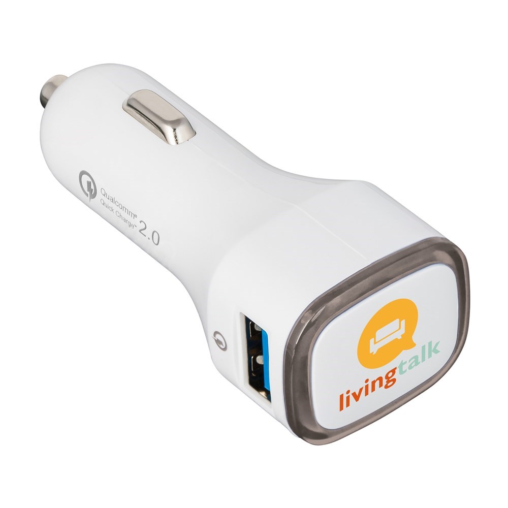 Dieser Quick charge 2.0-Autoladeadapter hilft, wenn der Akku unterwegs schnell aufgeladen werden muss. Voraussetzung: Ihr Handy ist schnellaufladefähig! Wenn nicht, lädt der Adapter Ihr Gerät dennoch in Standardgeschwindigkeit auf. Output bei zwei Ausgängen - Standardausgang USB DC 5V/1,6A und Quick charge 2.0 mit bis zu DC 5V/2,4A; DC9V/1,7A; DC 12V/1,2 A in Abhängigkeit vom zu ladenden Gerät. Das integrierte Schutzsystem bewahrt vor Überspannung, Überhitzung und Kurzschluss. Der umlaufende Farbring an der Werbefläche wird per LED hinterleuchtet.
