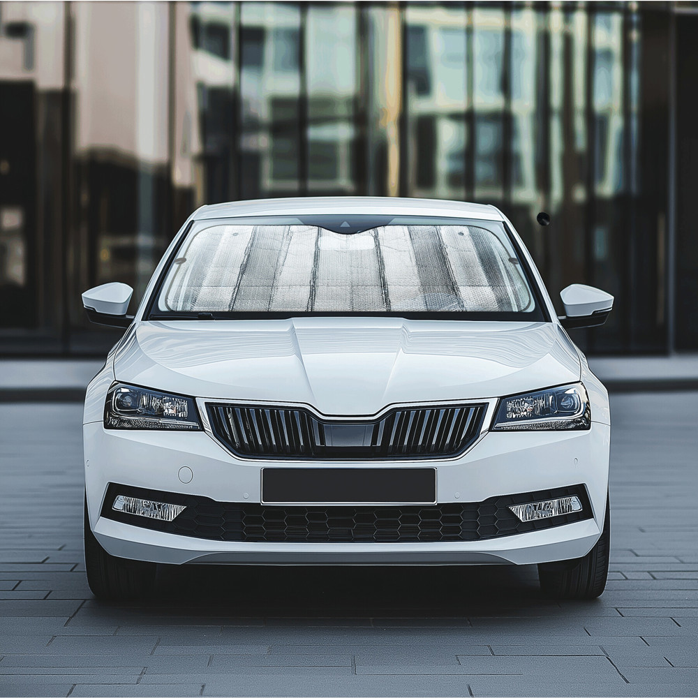 Auto-Sonnenschutz SHADOW FOLD: mit reflektierender Oberfläche, 2 seitliche Löcher zur Befestigung mit Saugnäpfen an der Frontscheibe, bei Nichtgebrauch durch Gummischlaufen platzsparend faltbar, inkl. 2 Saugnäpfen