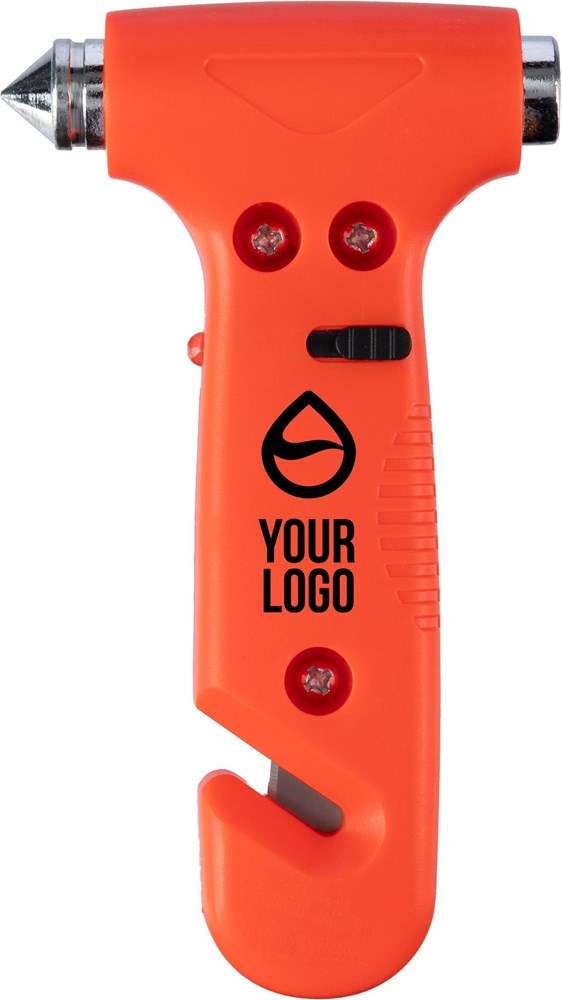 ABS-Nothammer, einschließlich weißer LED-Leuchte (Ein-/Ausschalter), integriertem Sicherheitsgurtschneider und Fensterhammer. Der Hammer ist mit einer Gummispitze geschützt. Einzeln verpackt in einem braunen Karton.