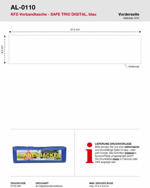 Unsere KFZ-Verbandstasche Safe Trio Digital wird mit einem 4-farbigem Digitaltransfer bedruckt.... mehr