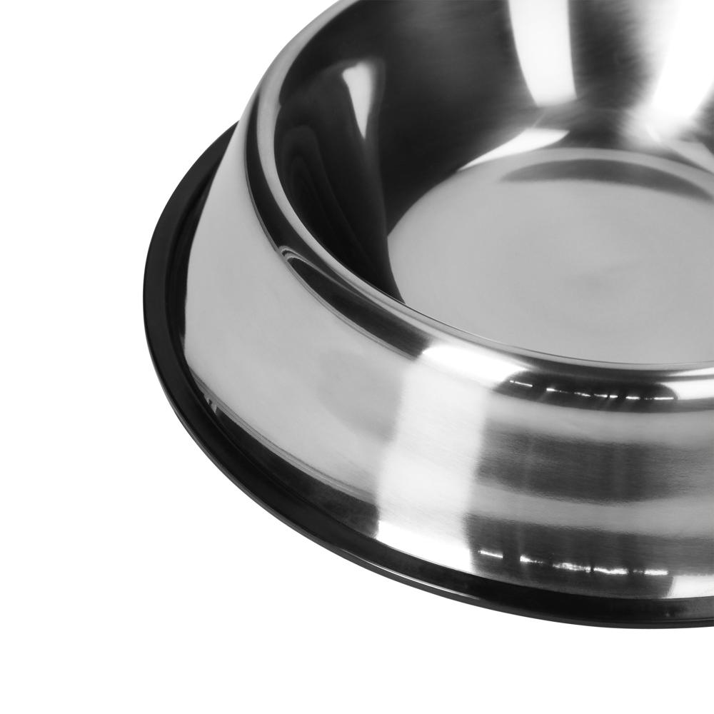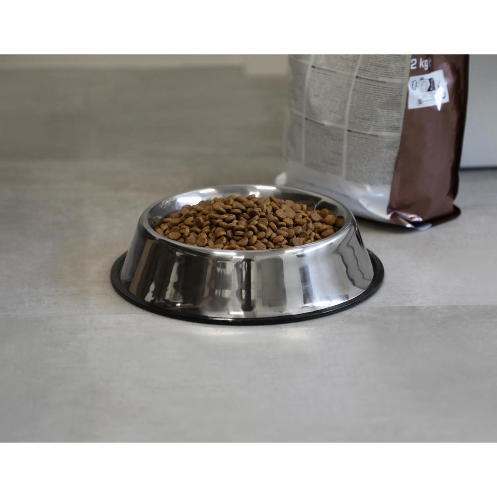 Robuster Futternapf aus Edelstahl für Welpen, Hunde und Katzen. Perfekt für Trocken- und Nassfutter, Leckerlis oder Wasser geeignet. Durch sein durchdachtes Design kann der Napf nicht umkippen. Der Gummiring verhindert ein Verrutschen und schützt den Boden vor Kratzern. Leicht zu reinigen und lange haltbar. Füllmenge: ca. 1,0 Liter.