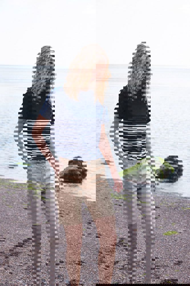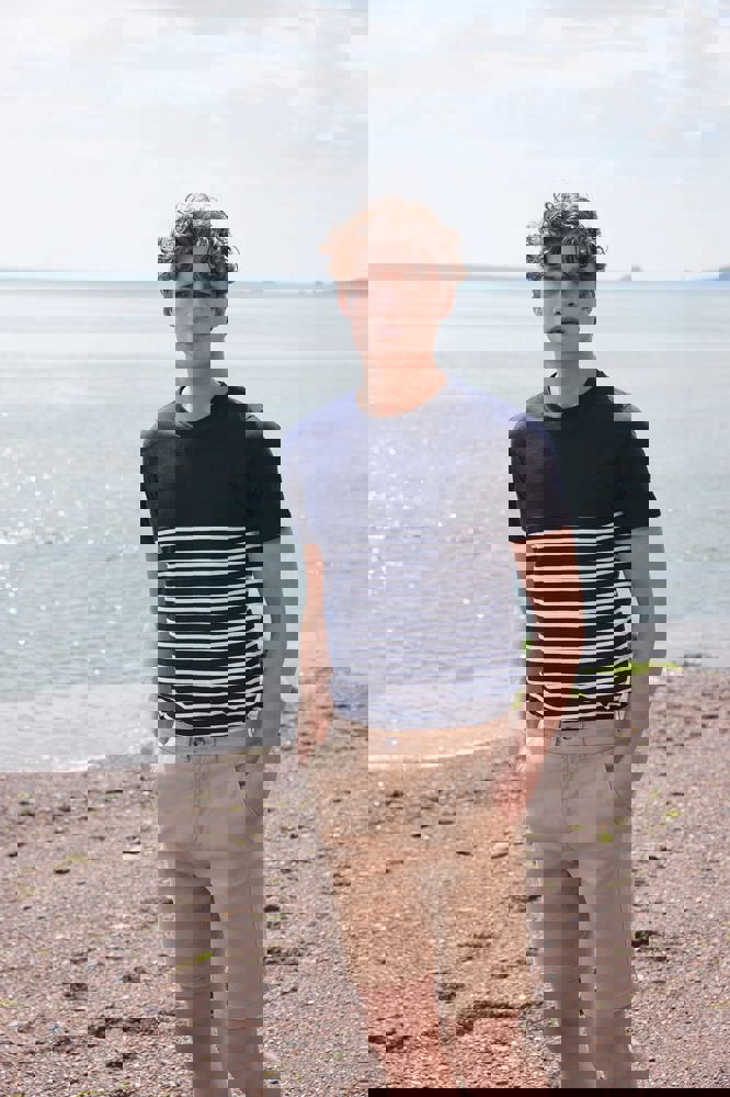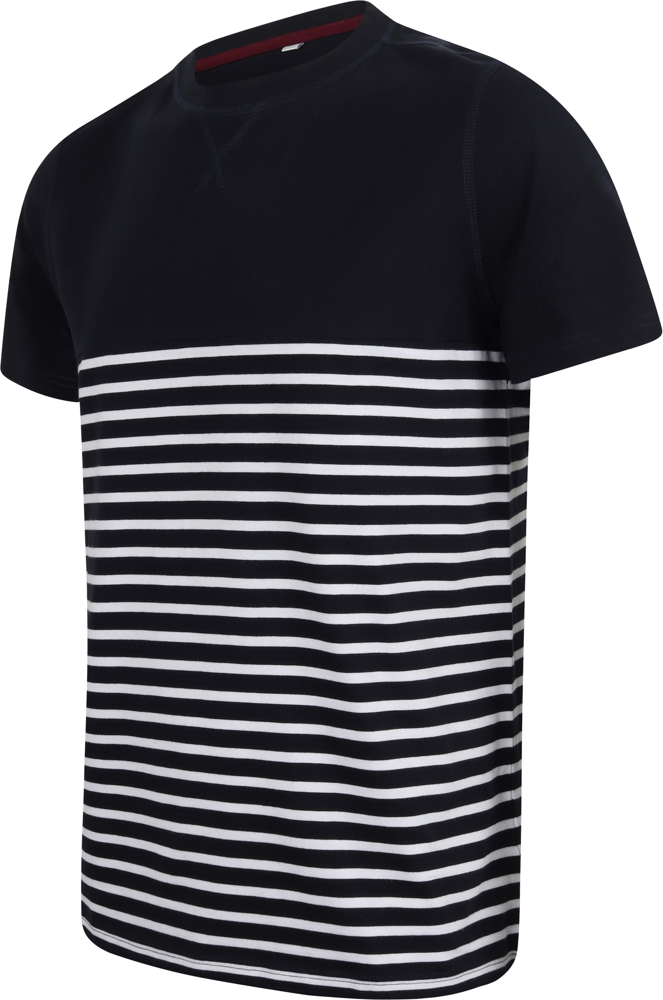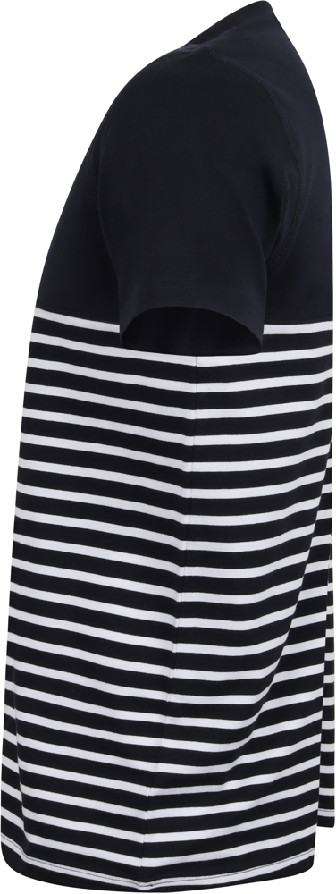 100 % Baumwolle Single Jersey. Etikettfreies, solides, kurzärmeliges T-Shirt in normaler Passform. Rundhalsausschnitt mit Stretch-Rippstrickeinfassung. Doppelsteppnähte an Ärmeln und Saum. 'V'-Flatlock-Nähte am Kragen. Flatlock-Nähte an Kragen, Schulternaht und Armlöchern. Hoher Brustsaum. Streifen im unteren Shirtbereich; einfache Shirtfarbe mit kontrastfarbenen Ärmeln.