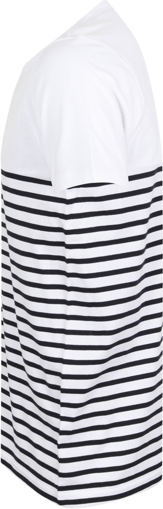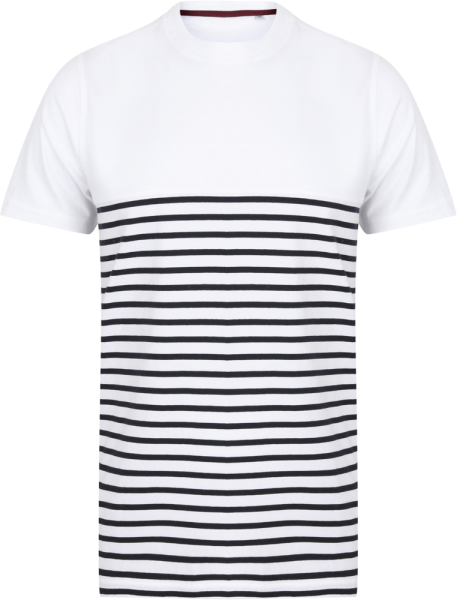 100 % Baumwolle Single Jersey. Etikettfreies, solides, kurzärmeliges T-Shirt in normaler Passform. Rundhalsausschnitt mit Stretch-Rippstrickeinfassung. Doppelsteppnähte an Ärmeln und Saum. 'V'-Flatlock-Nähte am Kragen. Flatlock-Nähte an Kragen, Schulternaht und Armlöchern. Hoher Brustsaum. Streifen im unteren Shirtbereich; einfache Shirtfarbe mit kontrastfarbenen Ärmeln.