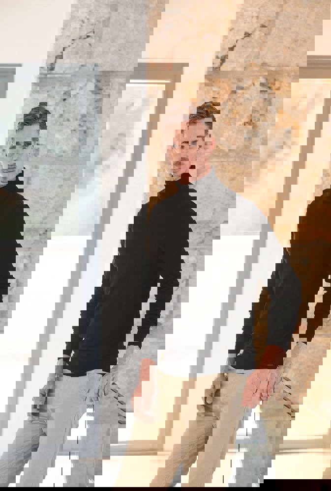 50% Baumwolle / 50% Polyacryl. Langarm Rollkragenpullover. Heraustrennbares Etikett. Rippstricksaum und Ärmel.