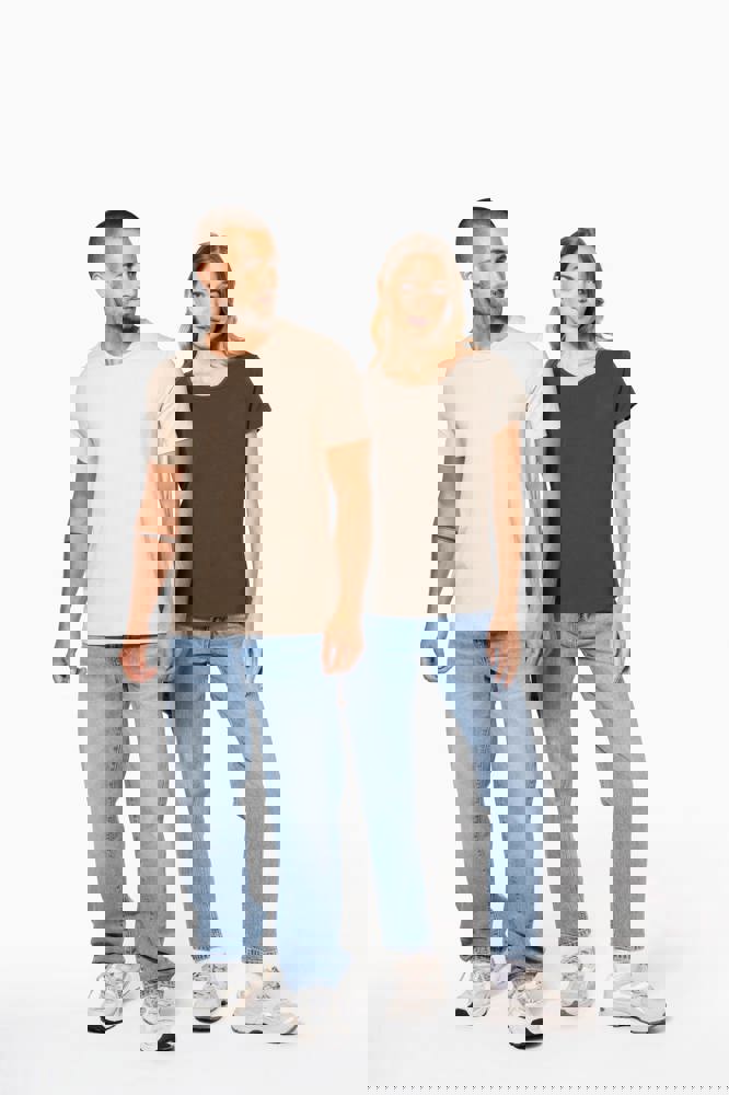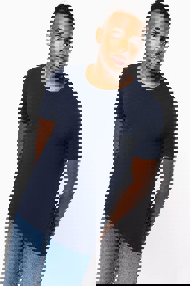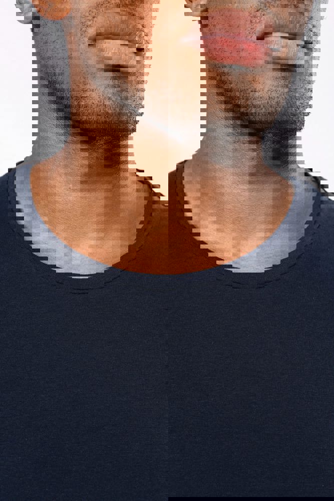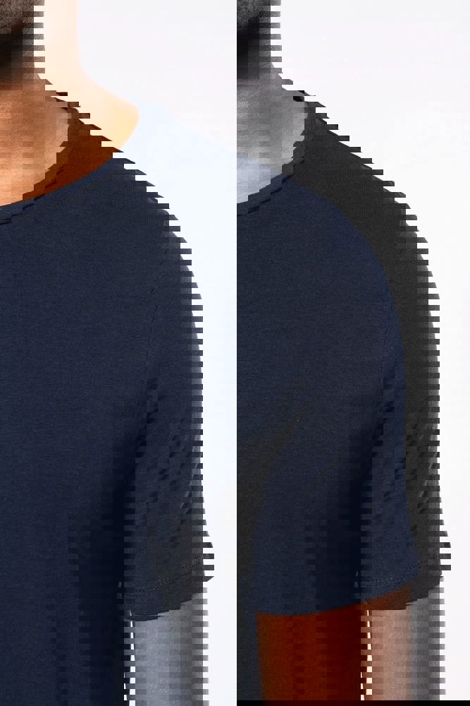 97 % Baumwolle / 3 % Elasthan. Melierte Farben: 87 % Baumwolle / 9 % Viskose / 4 % Elasthan. Runder Ausschnitt. Doppelnähte an Ärmelbündchen und unterem Saum. Moderner, körpernaher Schnitt im Prêt-à-porter-Stil.