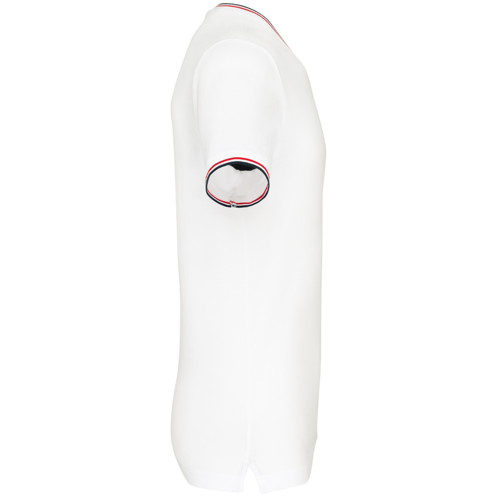 100 % gekämmter Baumwoll-Piqué (Melierte Farben: 90 % Baumwolle / 10 % Viskose). In Kontrastfarben gestreifte Strickbündchen an Hals und Ärmeln. Kontrastfarbenes Nackenband und Seitenschlitze. Doppelnaht am unteren Saum.