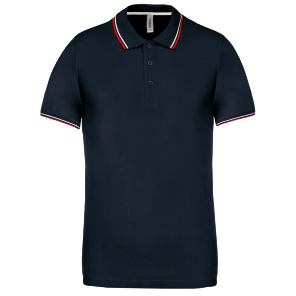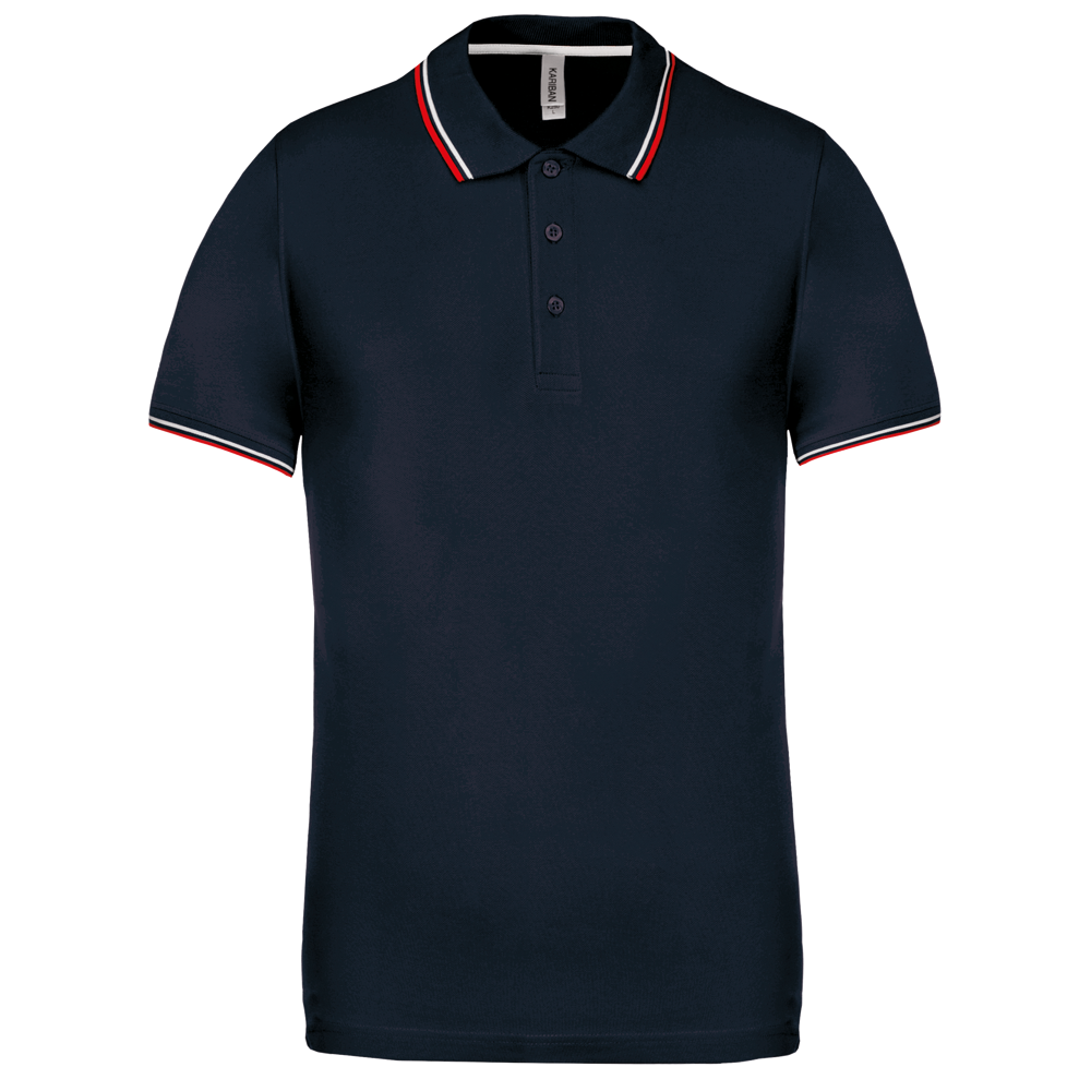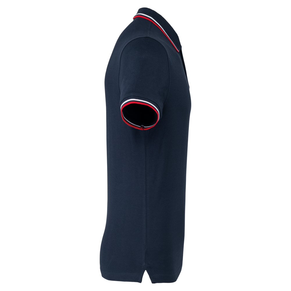 100% Baumwollpiqué. Rippstrickkragen und Ärmelabschluss mit Kontraststreifen. 3-Knopfleiste. Kontrast-Nackenband. Doppelnahtsaum und Seitenschlitze.