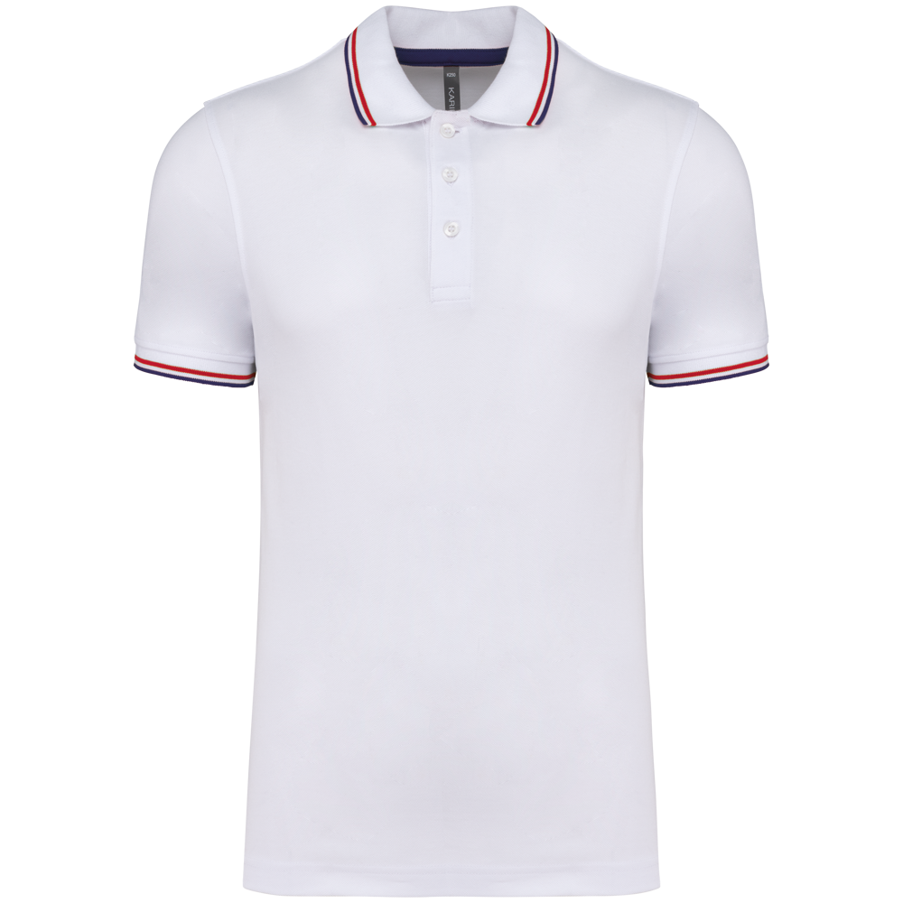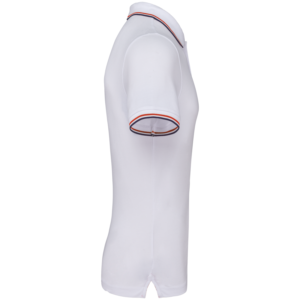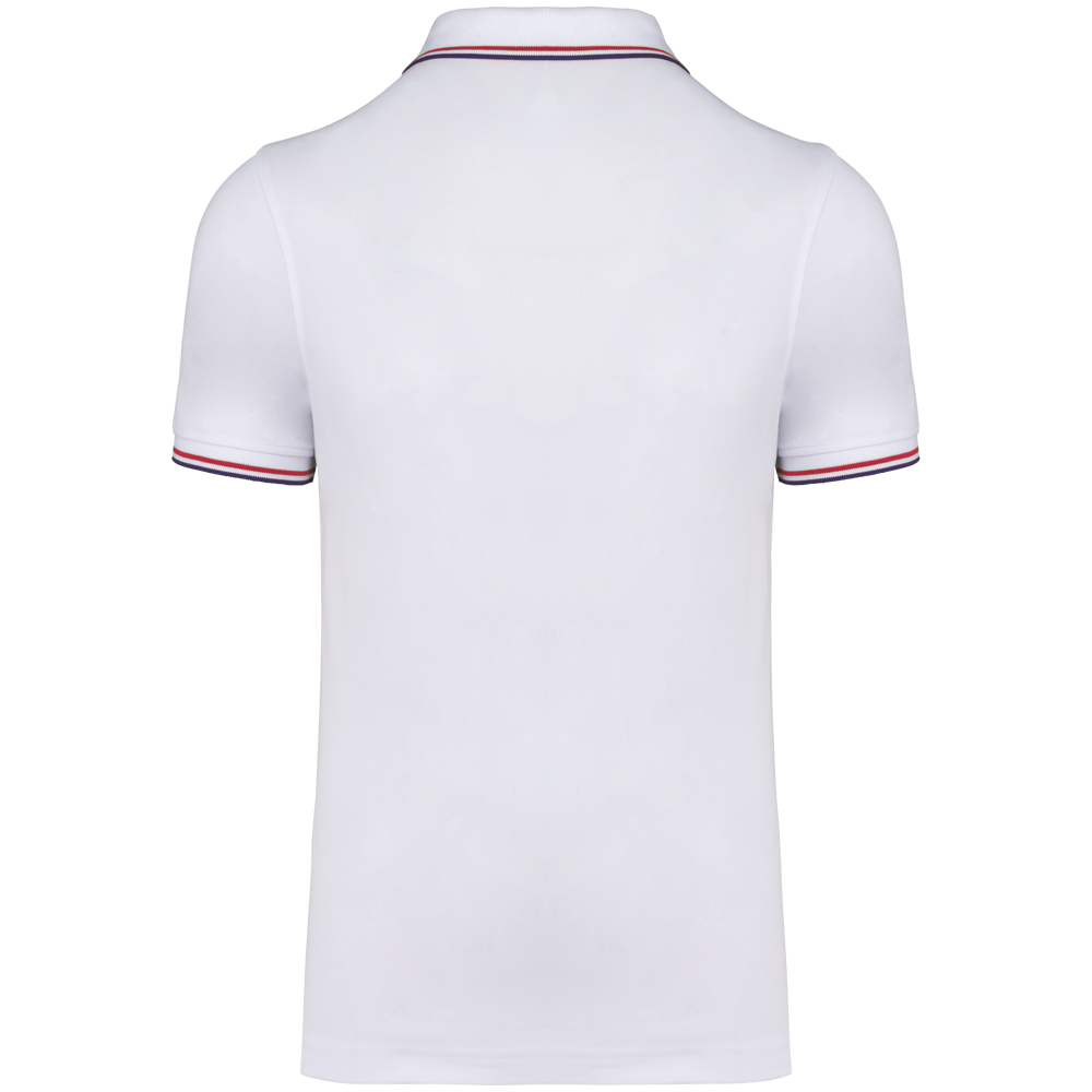 100% Baumwollpiqué. Rippstrickkragen und Ärmelabschluss mit Kontraststreifen. 3-Knopfleiste. Kontrast-Nackenband. Doppelnahtsaum und Seitenschlitze.