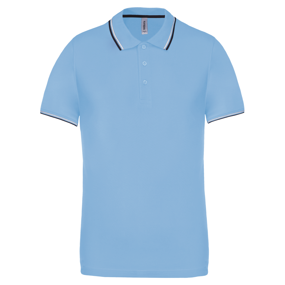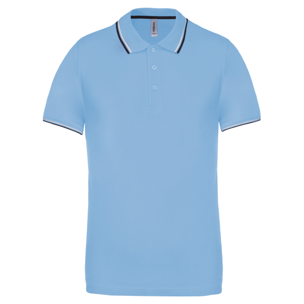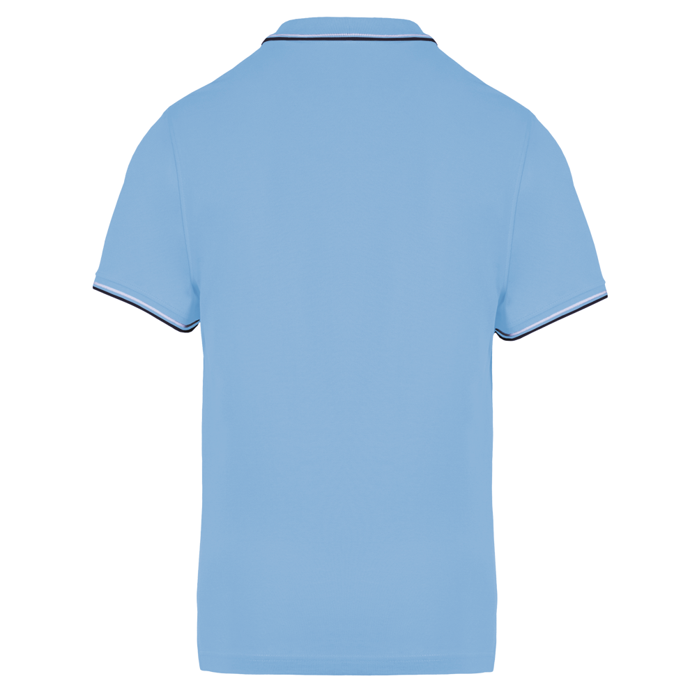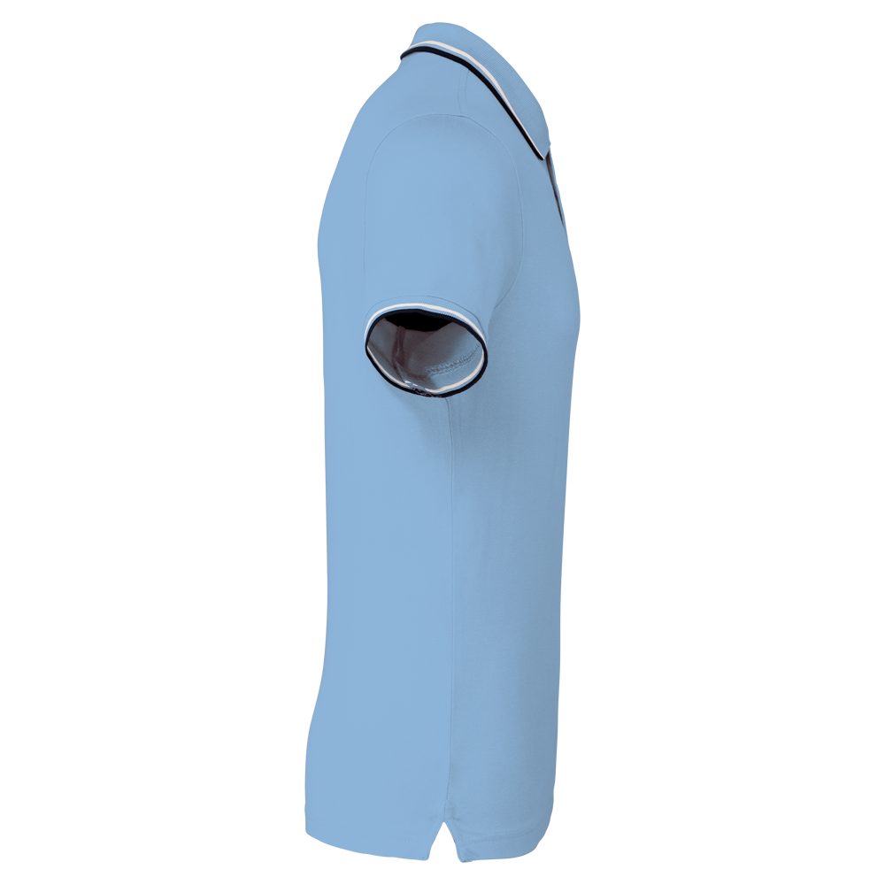 100% Baumwollpiqué. Rippstrickkragen und Ärmelabschluss mit Kontraststreifen. 3-Knopfleiste. Kontrast-Nackenband. Doppelnahtsaum und Seitenschlitze.