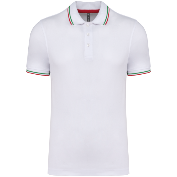 100% Baumwollpiqué. Rippstrickkragen und Ärmelabschluss mit Kontraststreifen. 3-Knopfleiste. Kontrast-Nackenband. Doppelnahtsaum und Seitenschlitze.