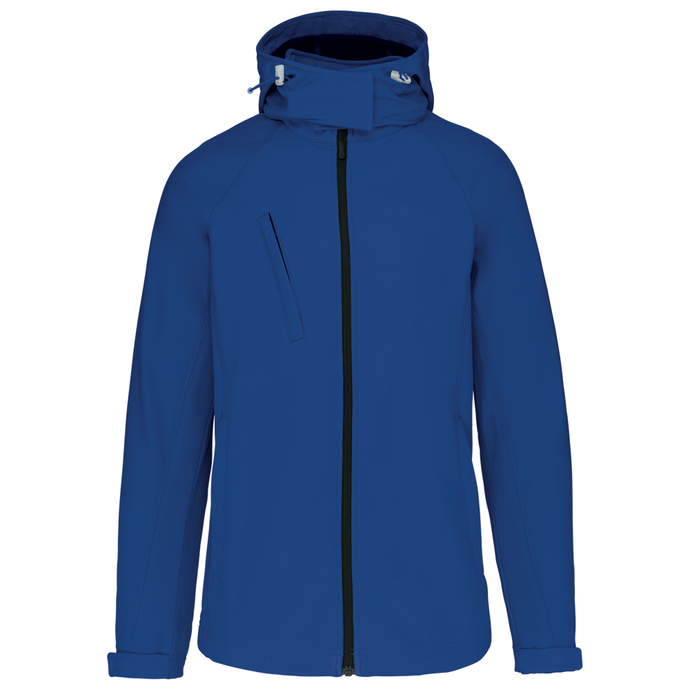 95% Polyester 5% Elasthan. 3-lagiges Verbund-Fleece. Membrantechnologie: atmungsaktiv 1000 g/m2/24h und wasserabweisend 5000 mm. Außenschicht: 95% Polyester 5% Elasthan, Mittelschicht: atmungsaktiv. Innenschicht: Polarfleece. Raglanärmel. Durchgehender Reißverschluss. 2 Vordertaschen mit Reißverschluss. 1 Brusttasche mit Reißverschluss. Ärmelverstellung mittels Klettverschlüssen. Abnehmbare Kapuze mit Klettverschluss. Kordelzug an der Kapuze. Innen unsichtbarer Reißverschluss zum Veredeln.
