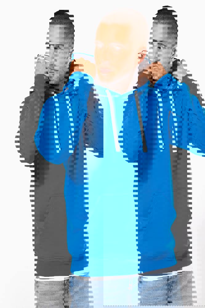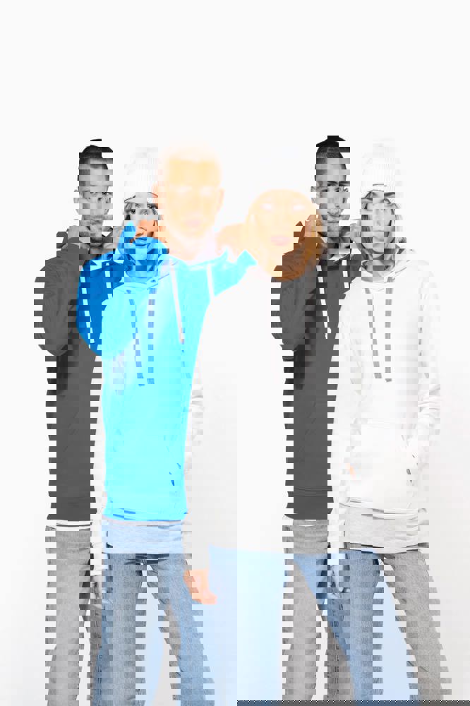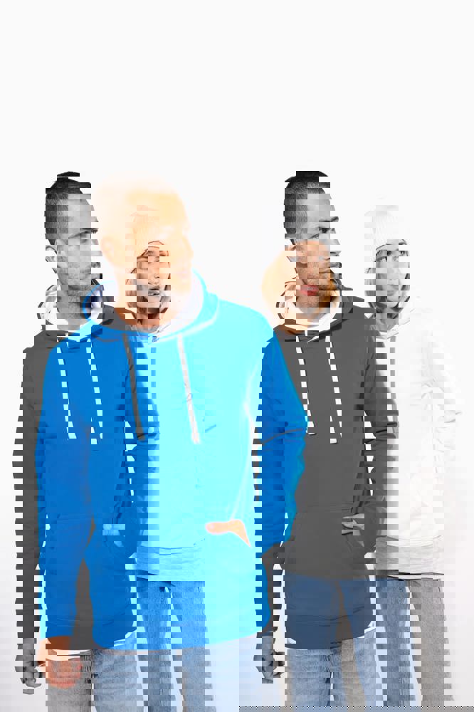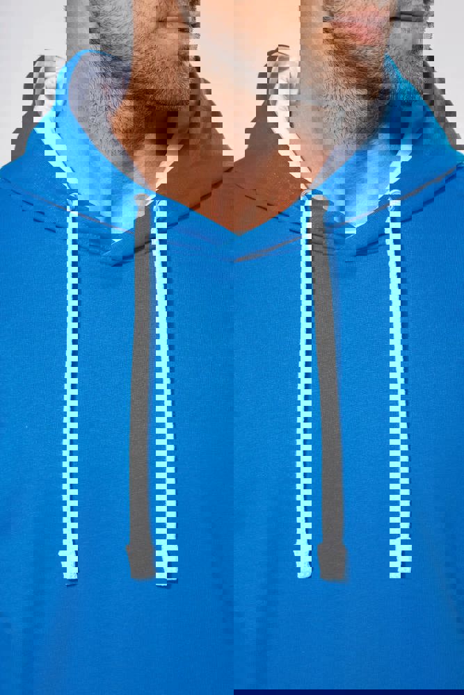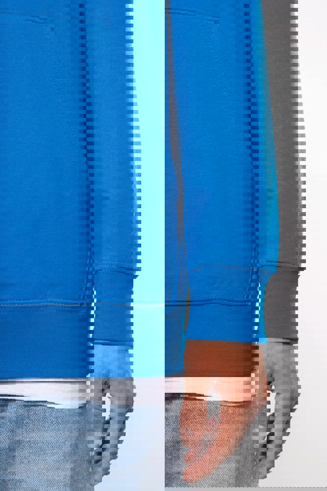 80% Baumwolle / 20% Polyester. Gekämmte Baumwolle. Gebürstetes Fleece. Kängurutasche und Kragen mit Kopfhörerkabel-Durchzug. Strickbündchen an Ärmeln und Saum. Gefütterte Kapuze inwendig und Kordelzug in Kontrastfarbe.