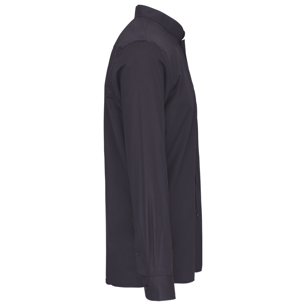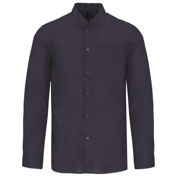65% Polyester / 35% Popeline-Baumwolle. Pflegeleicht. Knopfloser Mao-Kragen. Ton-in-Ton Knöpfe. Abgerundete Brusttasche links. Lange Ärmel mit abgerundeten und weitenverstellbaren Manschetten. 2 Ersatzknöpfe.
