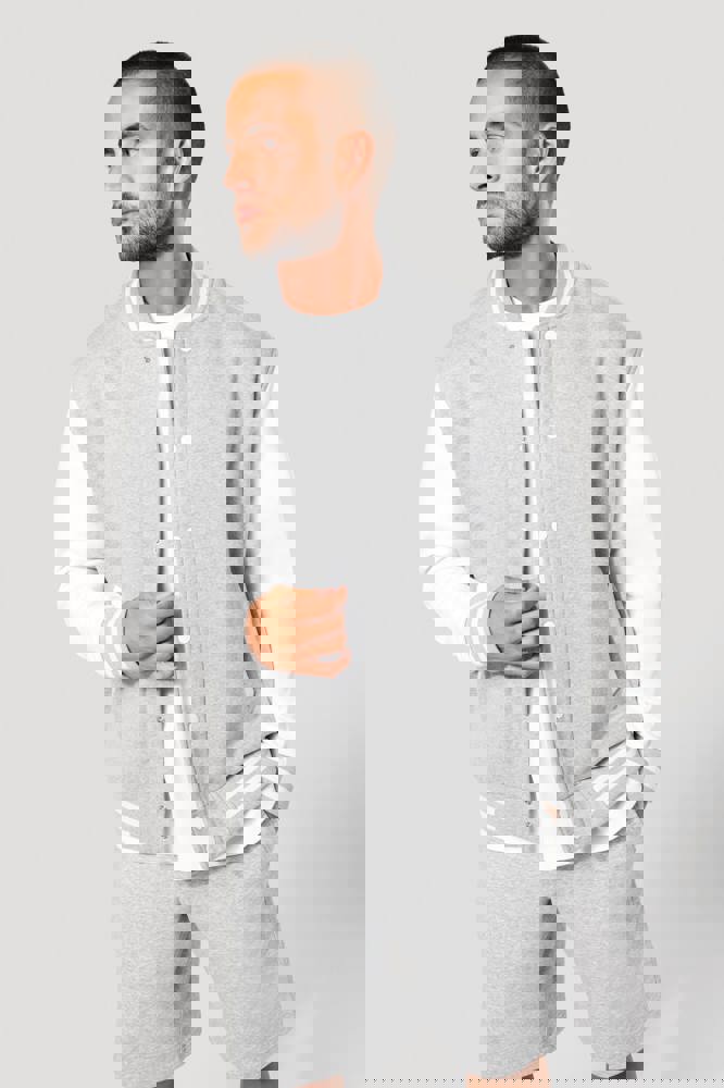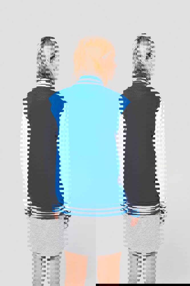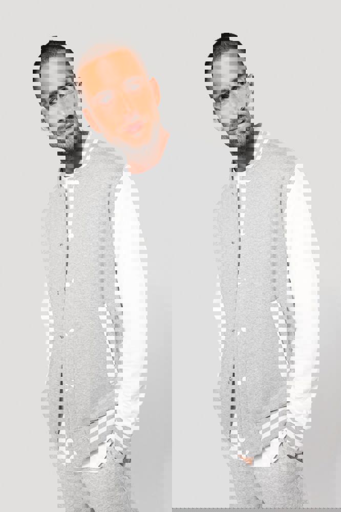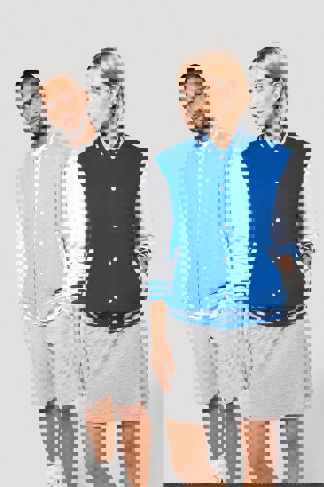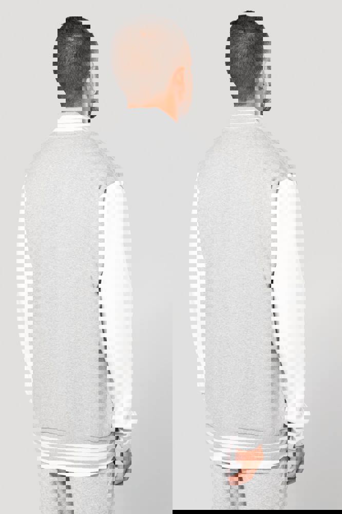 70 % Baumwolle / 30 % Polyester. Gebürstetes 3-Faden-Fleece. Kontrastfarbene Set-in-Ärmel. Kontrastfarbener Druckknopf-Verschluss auf der Vorderseite. Strickbündchen mit zwei kontrastfarbenen Paspeln an Kragen, Ärmeln und unterem Saum. 2 kontrastfarbene Paspeltaschen auf der Vorderseite. Fischgrätnackenband und Befestigungsschlaufe auf der Krageninnenseite. Kein Markenetikett am Kragen, nur Größenkennzeichnung, für eine leichtere Veredelung. Die College Jacke ist ein echtes Kultmodell, das bereits zahlreiche Moden überstanden hat. Man sieht sie überall, sowohl in der Straße als auch in Schulen und sogar auf den Laufstegen.