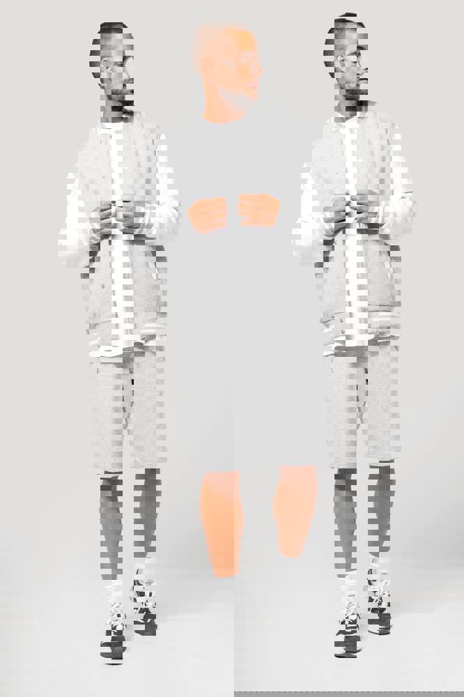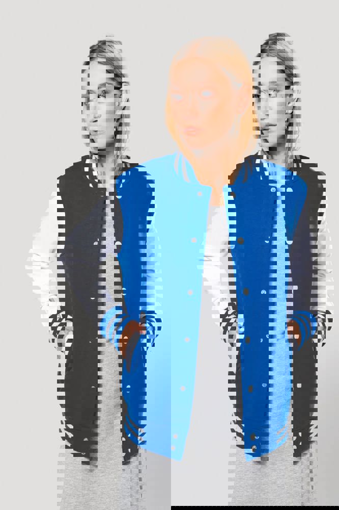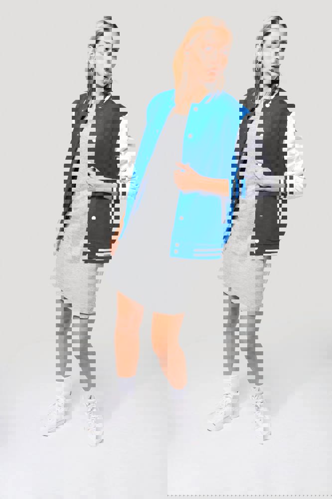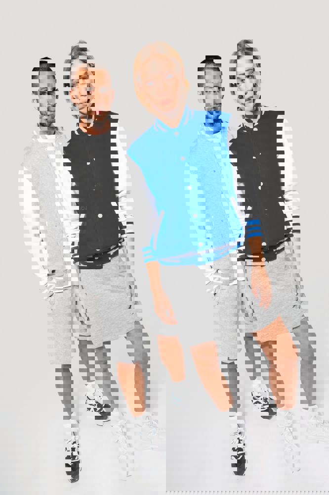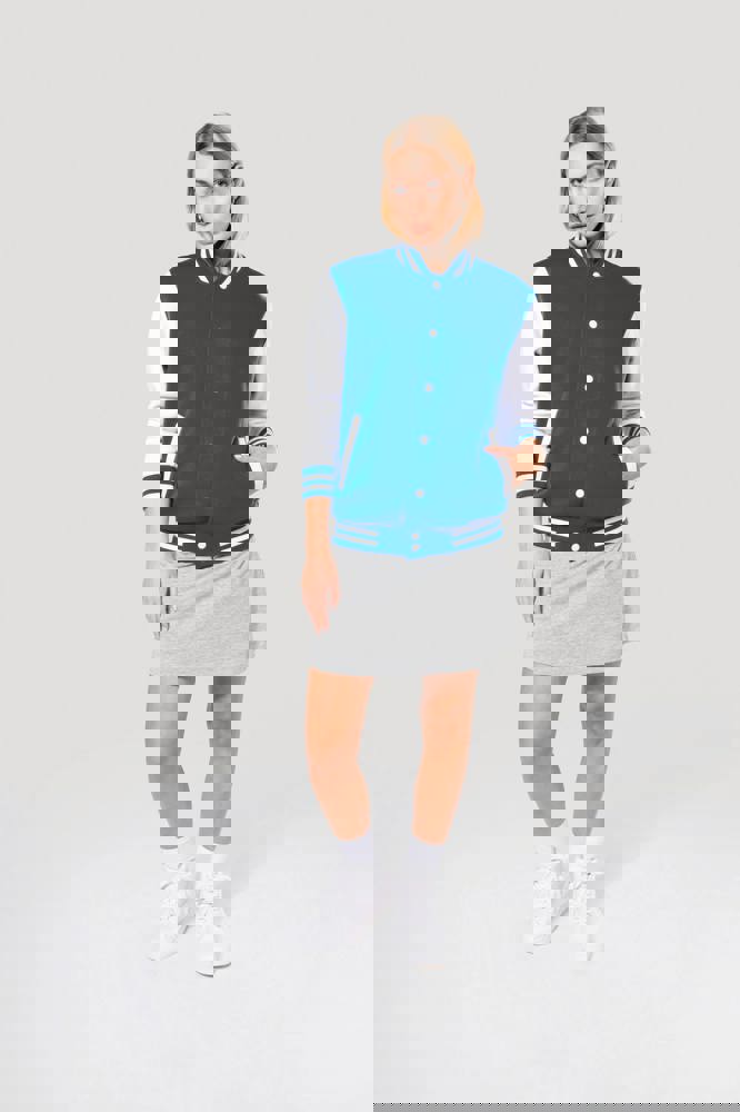 70 % Baumwolle / 30 % Polyester. Gebürstetes 3-Faden-Fleece. Kontrastfarbene Set-in-Ärmel. Kontrastfarbener Druckknopf-Verschluss auf der Vorderseite. Strickbündchen mit zwei kontrastfarbenen Paspeln an Kragen, Ärmeln und unterem Saum. 2 kontrastfarbene Paspeltaschen auf der Vorderseite. Fischgrätnackenband und Befestigungsschlaufe auf der Krageninnenseite. Kein Markenetikett am Kragen, nur Größenkennzeichnung, für eine leichtere Veredelung. Die College Jacke ist ein echtes Kultmodell, das bereits zahlreiche Moden überstanden hat. Man sieht sie überall, sowohl in der Straße als auch in Schulen und sogar auf den Laufstegen.