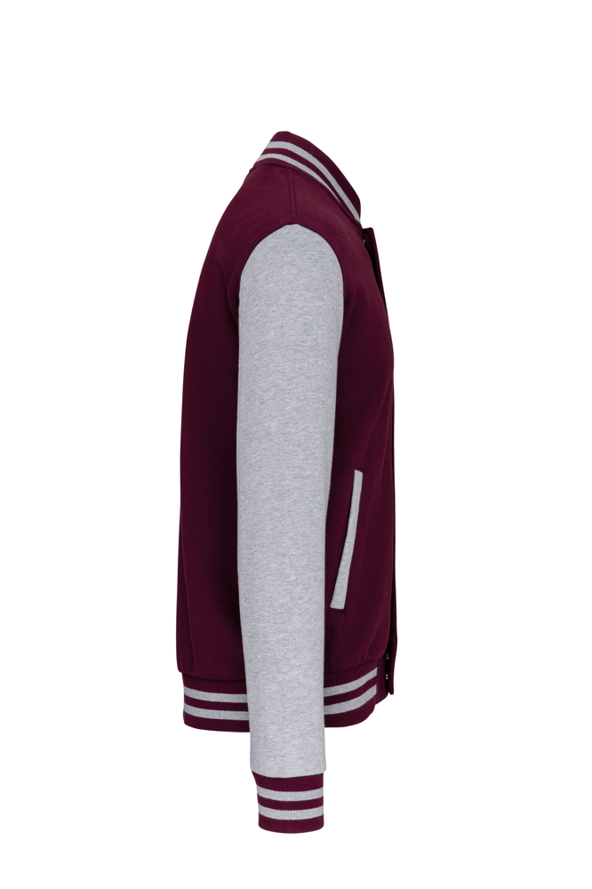 70 % Baumwolle / 30 % Polyester. Gebürstetes 3-Faden-Fleece. Kontrastfarbene Set-in-Ärmel. Kontrastfarbener Druckknopf-Verschluss auf der Vorderseite. Strickbündchen mit zwei kontrastfarbenen Paspeln an Kragen, Ärmeln und unterem Saum. 2 kontrastfarbene Paspeltaschen auf der Vorderseite. Fischgrätnackenband und Befestigungsschlaufe auf der Krageninnenseite. Kein Markenetikett am Kragen, nur Größenkennzeichnung, für eine leichtere Veredelung. Die College Jacke ist ein echtes Kultmodell, das bereits zahlreiche Moden überstanden hat. Man sieht sie überall, sowohl in der Straße als auch in Schulen und sogar auf den Laufstegen.