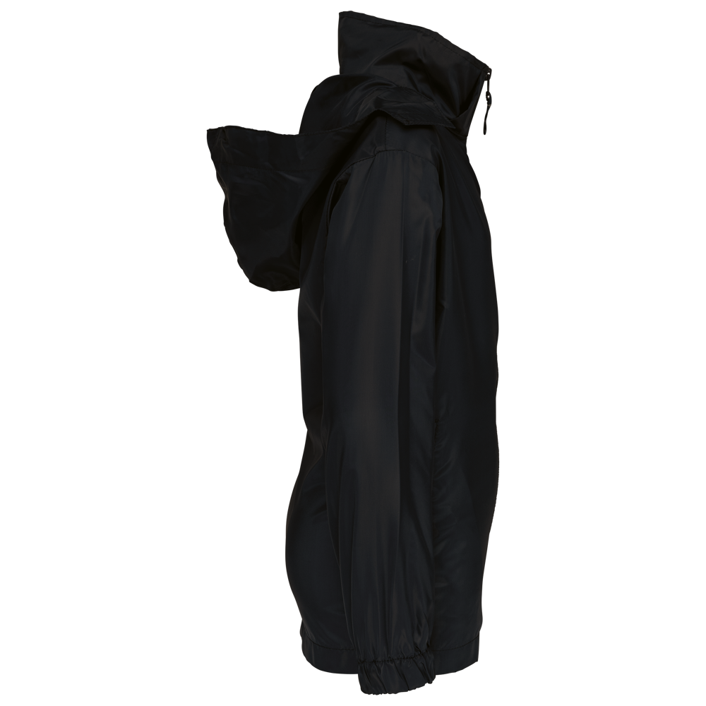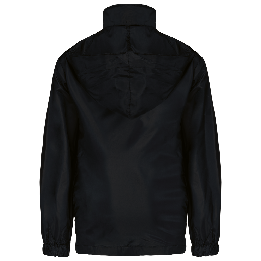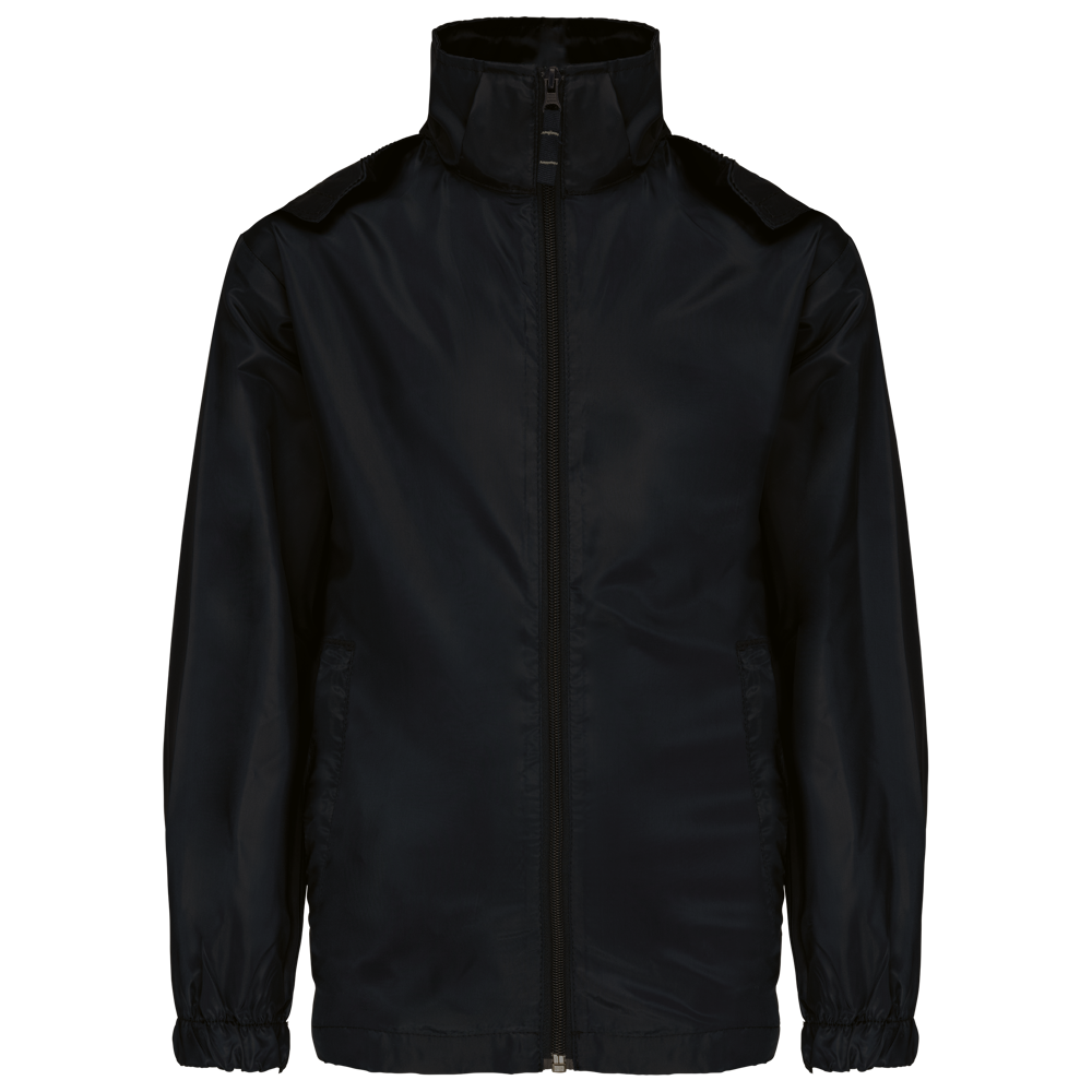 100% Polyester. Farblich abgestimmter Reißverschluss. Im Kragen verdeckte Kapuze mit Klettverschluss. 2 Fronttaschen mit Reißverschluss. Gummizug an Ärmelbund. Kann in eine Fronttasche hinein gefaltet werden (K-Way®-System).