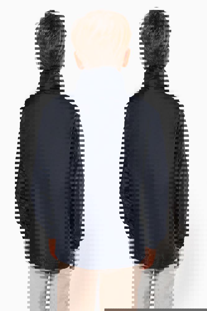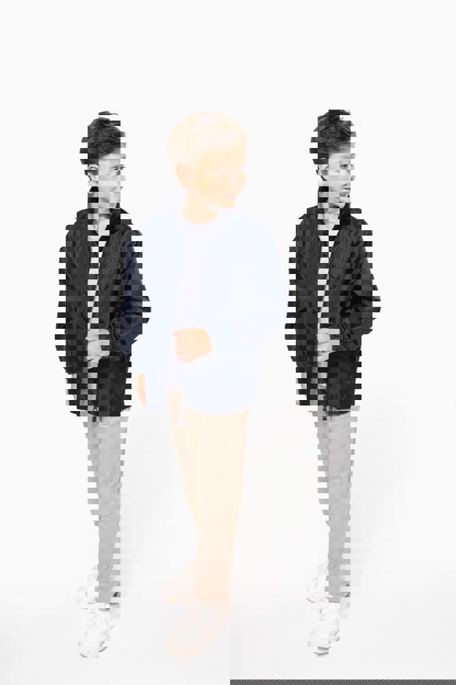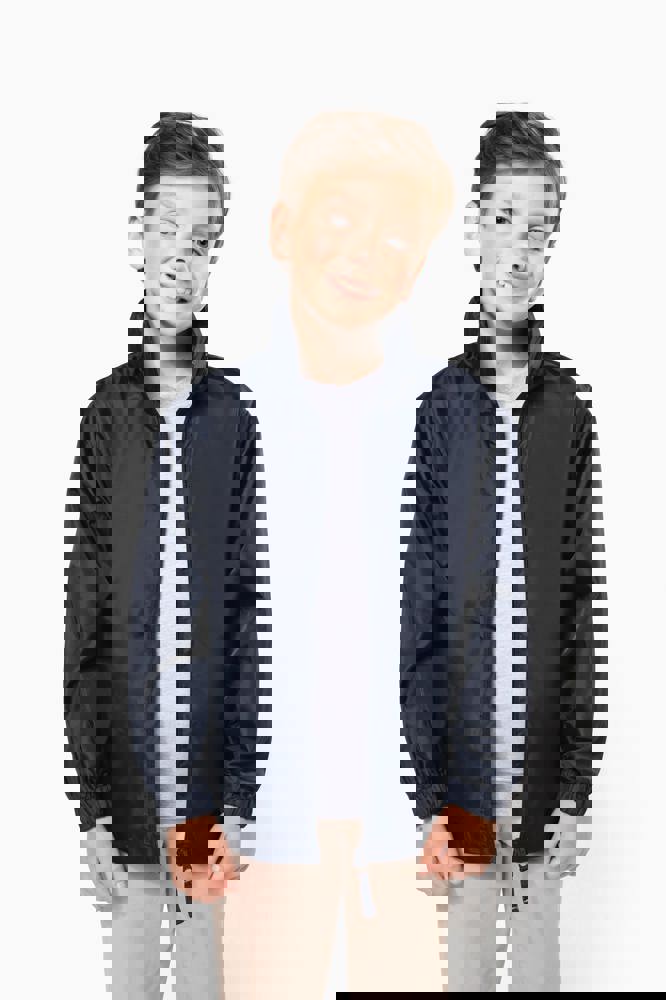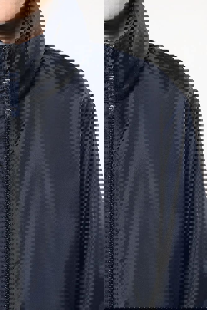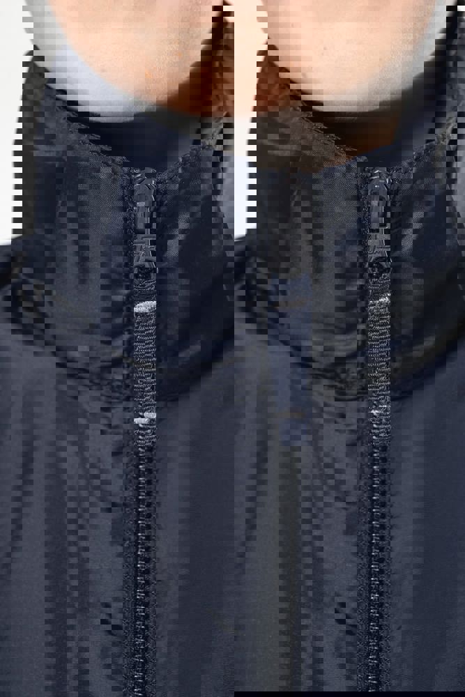 100% Polyester. Farblich abgestimmter Reißverschluss. Im Kragen verdeckte Kapuze mit Klettverschluss. 2 Fronttaschen mit Reißverschluss. Gummizug an Ärmelbund. Kann in eine Fronttasche hinein gefaltet werden (K-Way®-System).