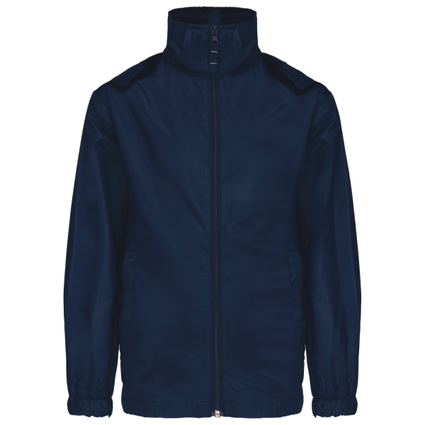 100% Polyester. Farblich abgestimmter Reißverschluss. Im Kragen verdeckte Kapuze mit Klettverschluss. 2 Fronttaschen mit Reißverschluss. Gummizug an Ärmelbund. Kann in eine Fronttasche hinein gefaltet werden (K-Way®-System).