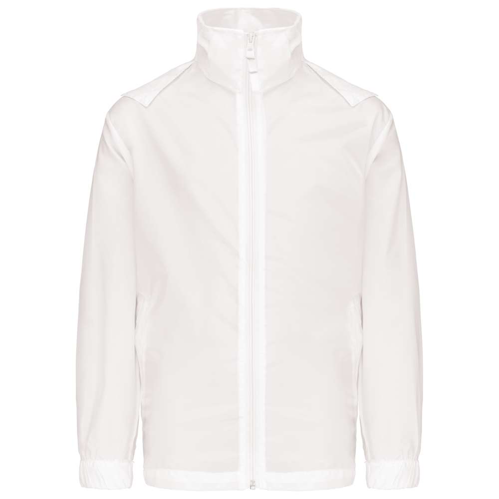 100% Polyester. Farblich abgestimmter Reißverschluss. Im Kragen verdeckte Kapuze mit Klettverschluss. 2 Fronttaschen mit Reißverschluss. Gummizug an Ärmelbund. Kann in eine Fronttasche hinein gefaltet werden (K-Way®-System).