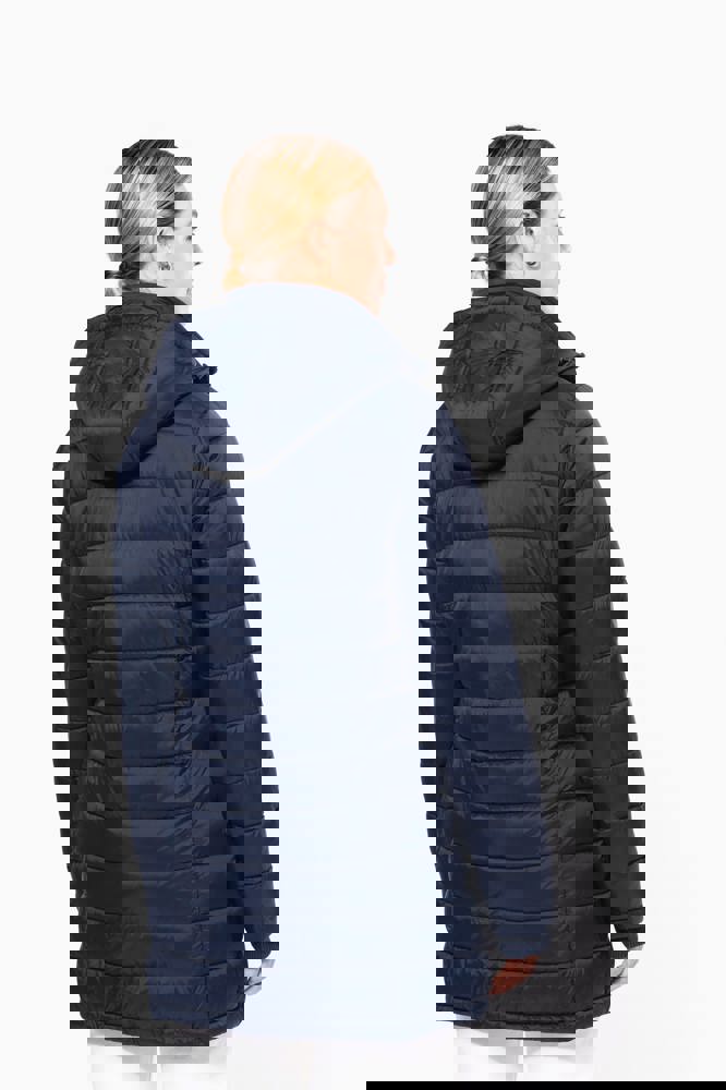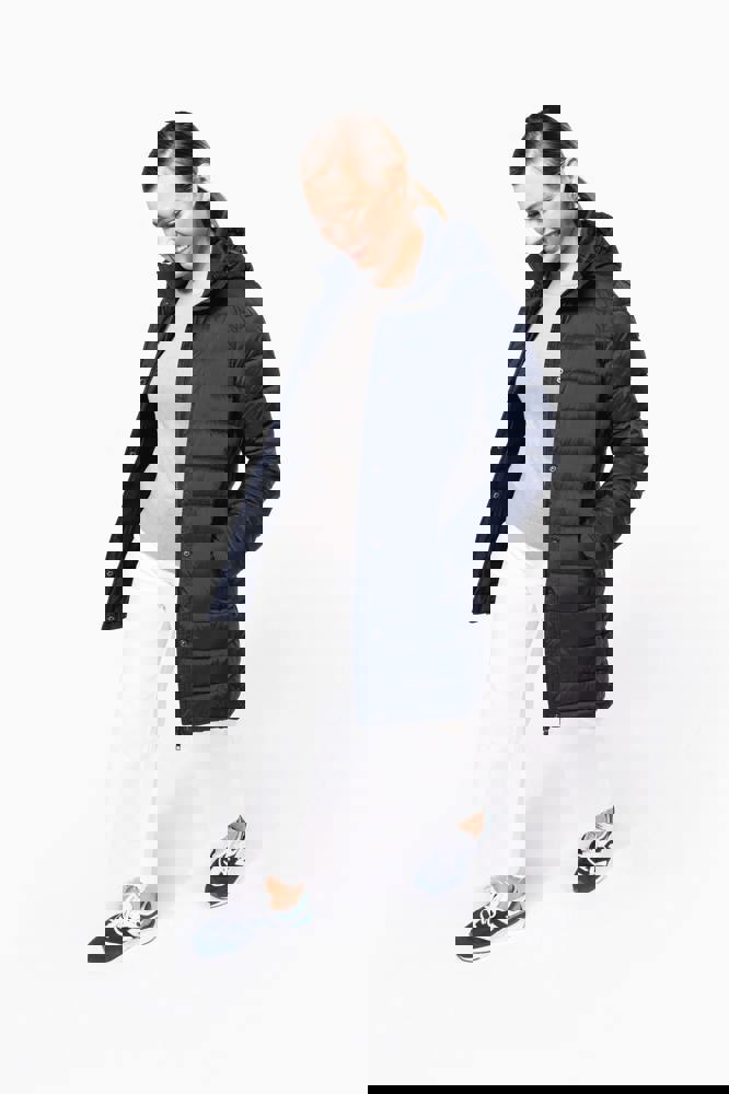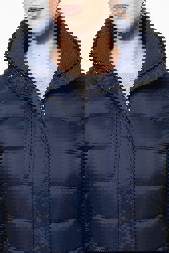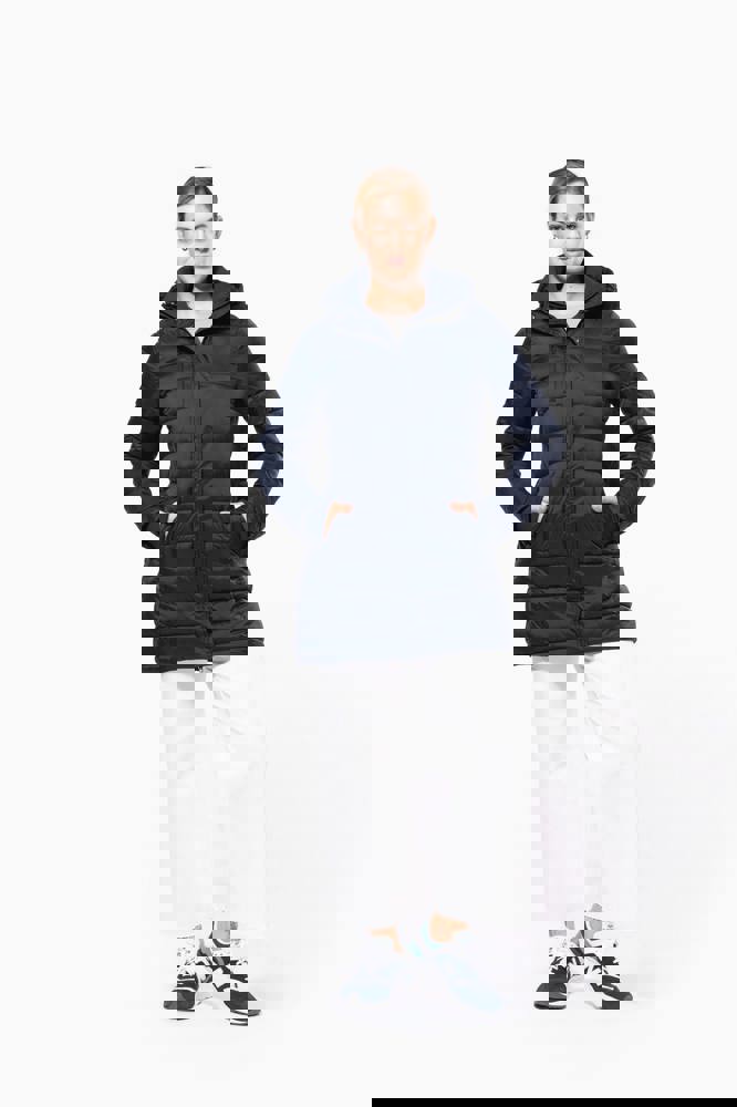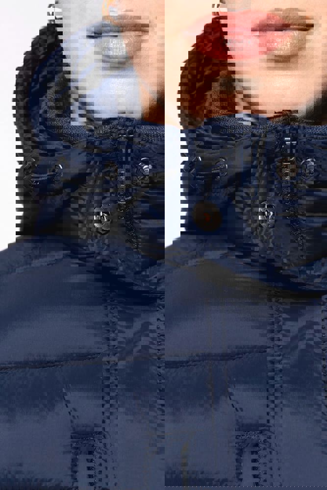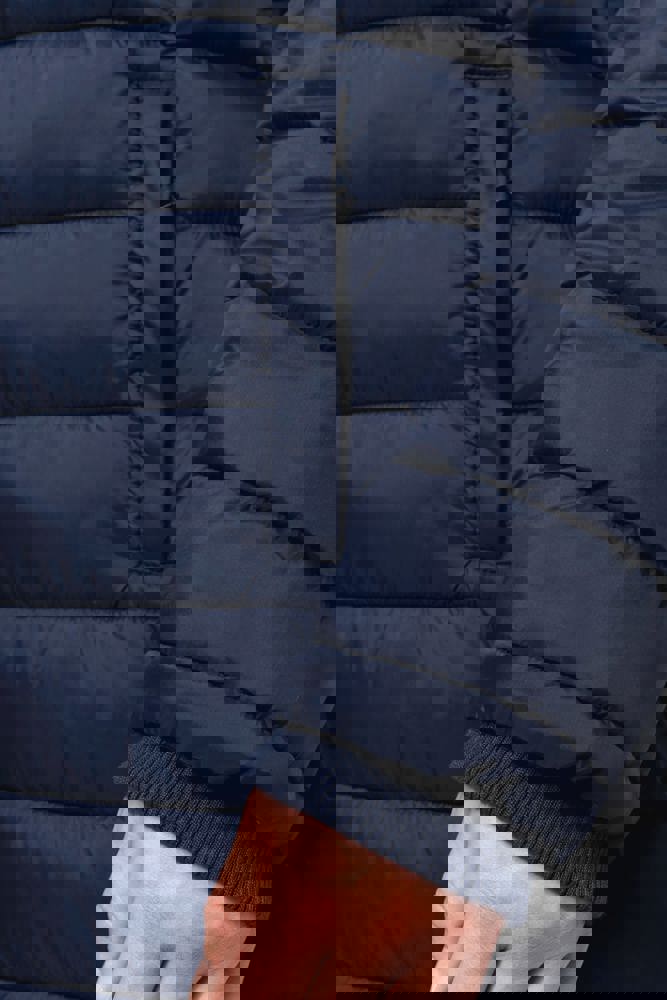 100 % Polyamid. Innenfutter Polyester. Warm und federleicht. Taillierter Schnitt. 2 Fronttaschen und 1 Brusttasche mit Reißverschluss und Paspel. Verdeckter Reißverschluss mit Druckknopfleiste. Strickbündchen an Hals und Ärmeln. Kapuzeninnenseite und Körper in Kontrastfarbe: Convoy Grey für Black. Kapuze und Körper Ton in Ton: Navy für Navy. Eingespritzte Wattierung: Das Gewicht kann je nach Bereich des Kleidungsstücks variieren. Das Gesamtgewicht dient nur zur Orientierung.