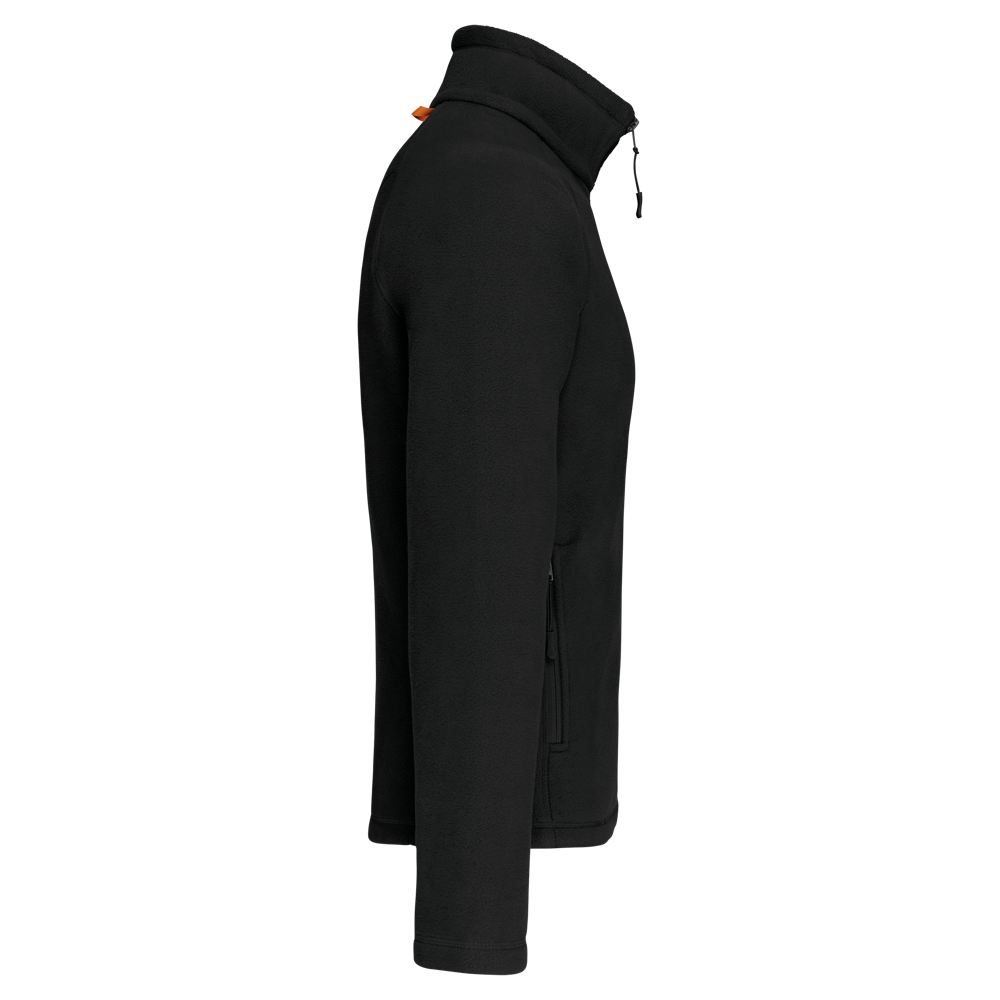 100% Polyester, Antipilling Microfleece. Raglanärmel. Durchgehender Reißverschluss. 2 Reißverschluss-Taschen vorne. 2 Innentaschen. Mit Kontrasten und Kordelzug.