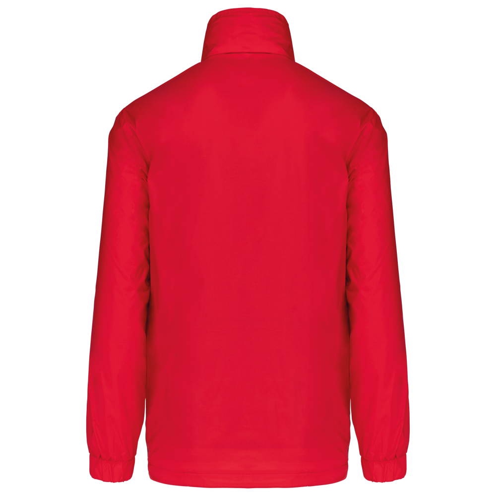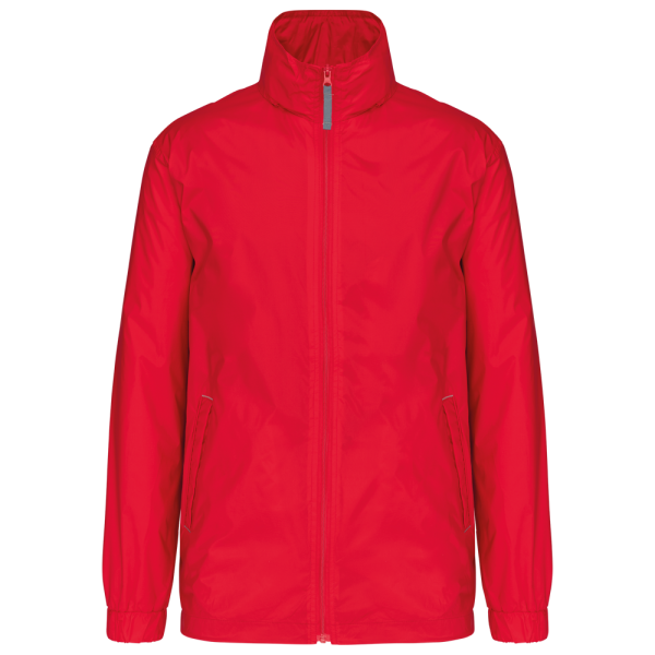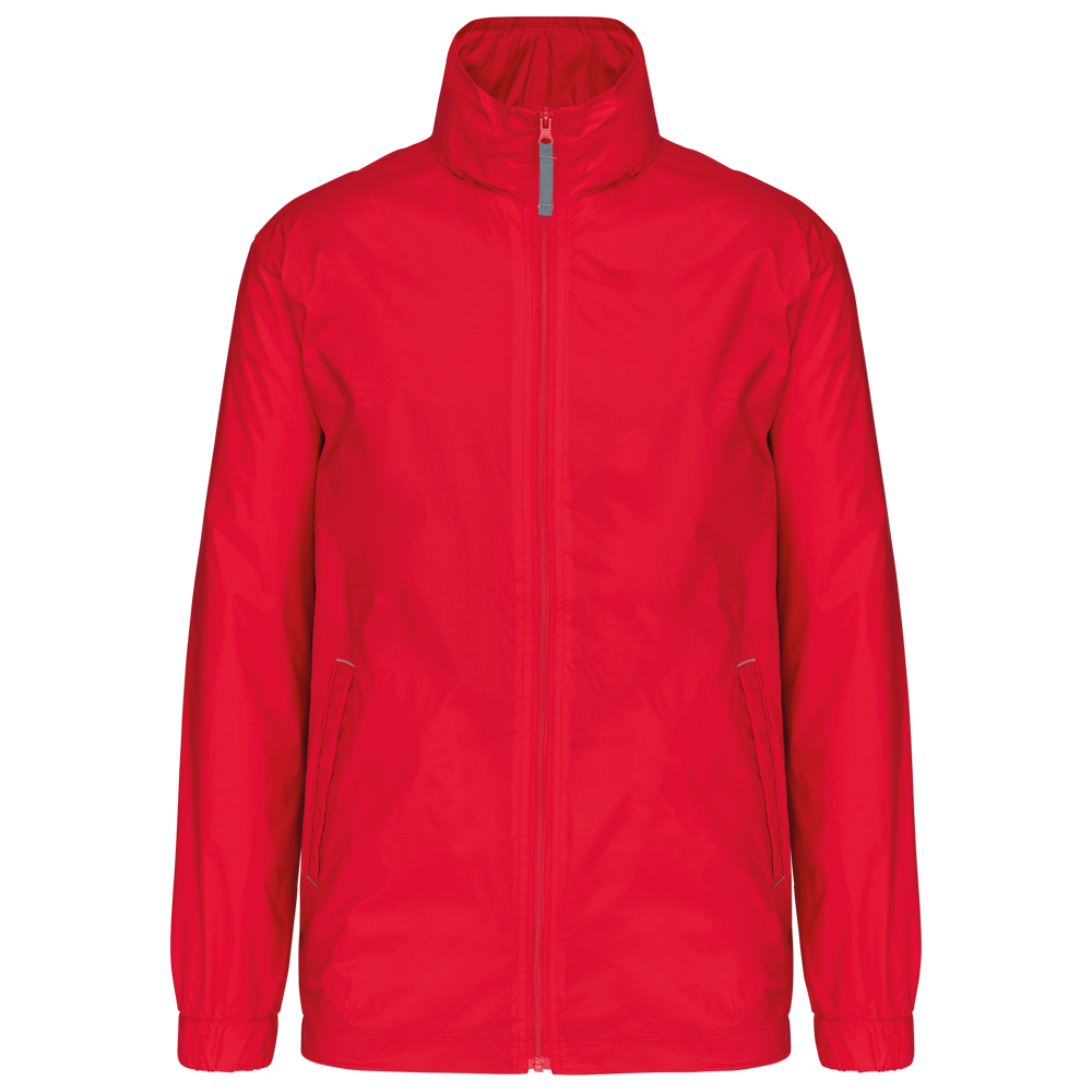 100% Polyamid 210 T mit Acrylbeschichtung. Durchgehender Reißverschluss. 2 Zipper-Taschen vorne mit kontrastierten Ziernähten. 1 Innentasche. Futter 100% Polyester: 3/4 Polyester und 1/4 Netz - wärmend aber luftig. Ärmelfutter 100% Polyester. Elastischer Kordelzug mit Stoppern am Bund. Kapuze im Kragen. Reißverschluss für leichtes Veredeln.