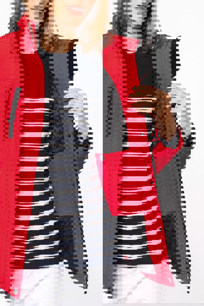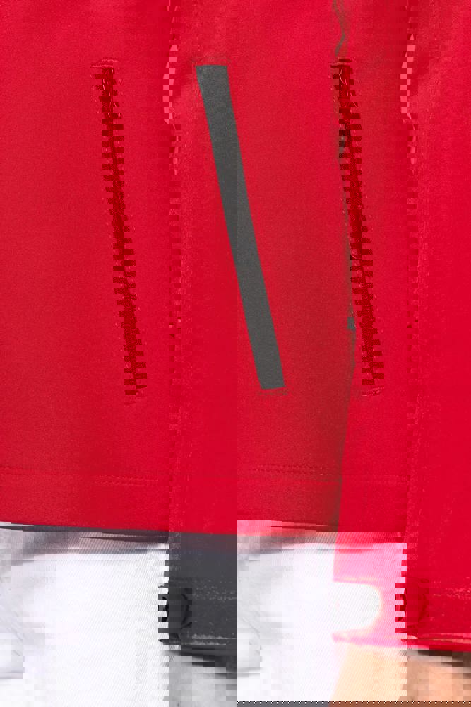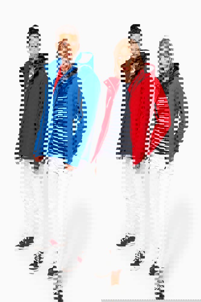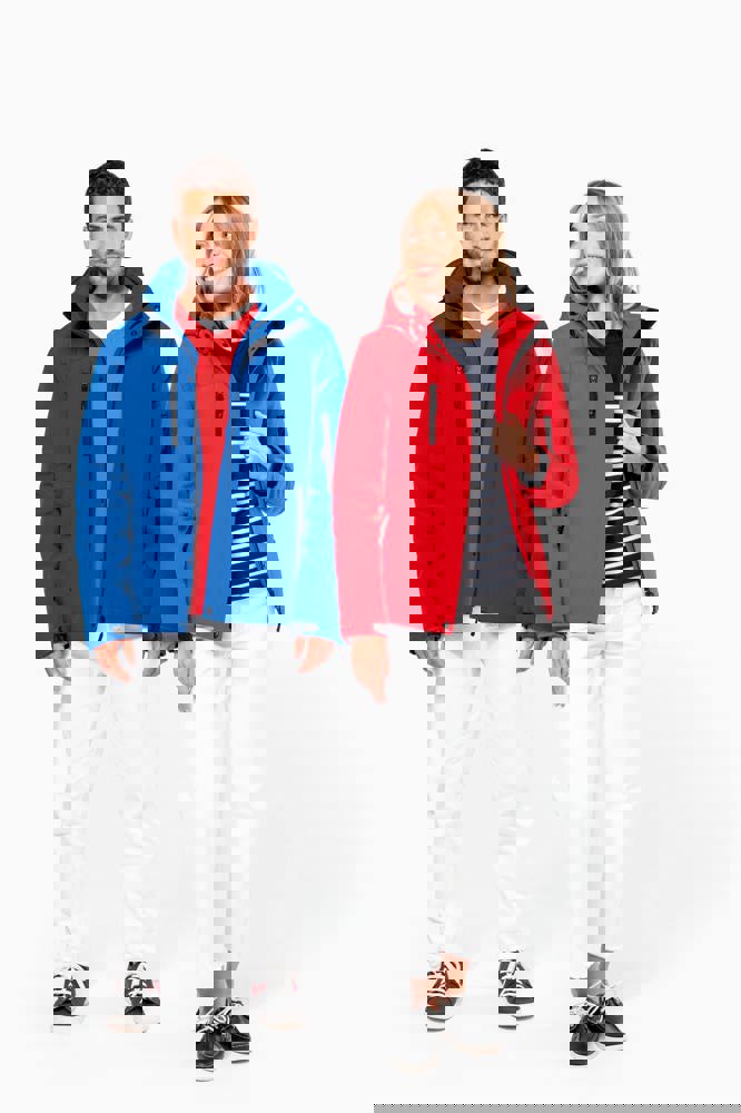 95 % Polyester / 5 % Elasthan. Dreilagiges Verbundgewebe atmungsaktiv 3.000 g/m²/24 h und wasserdicht 8.000 mm. Außenmaterial: 95 % Polyester / 5 % Elasthan. Atmungsaktive Mittelmembran. Innenschicht: Mikrofleece. Innenfutter gesteppt, 100 % Polyester. Vorderseite: 4 Reißverschlusstaschen (2 Seitentaschen, 1 am Ärmel, 1 an der rechten Brustseite). 2 Innentaschen mit Druckknopfverschluss. Abnehmbare Kapuze in 3-Bahnen-Design, gefüttert und gesteppt, Kordel mit Stoppern zum Zuziehen. Klettverschluss am Ärmel zur Weitenregulierung. 1 Reißverschluss an der Brusttasche und 1 Reißverschluss am Saum zur Veredelung.