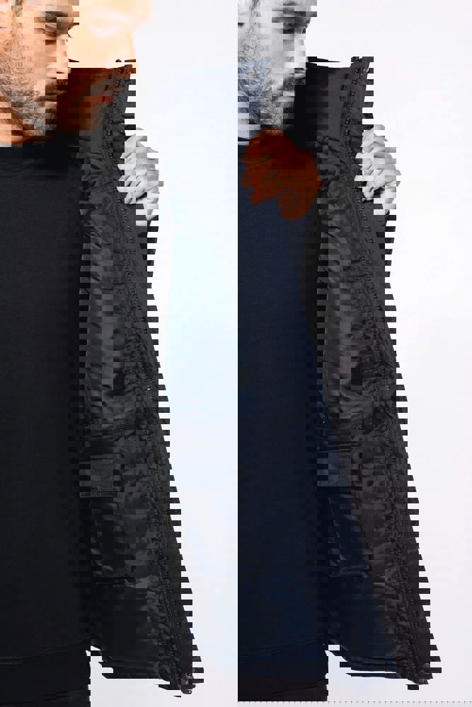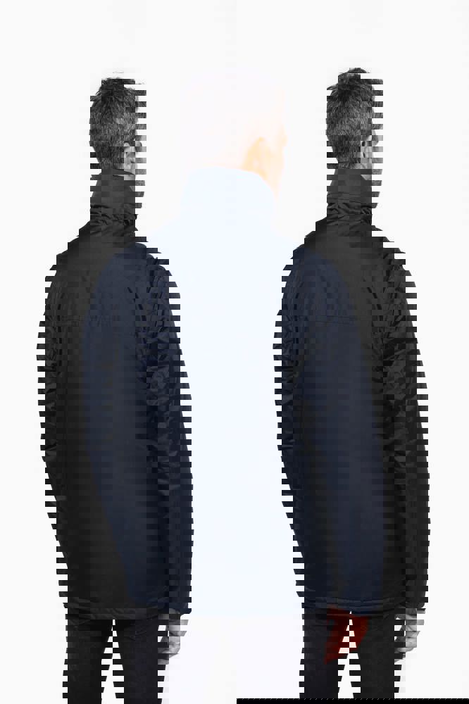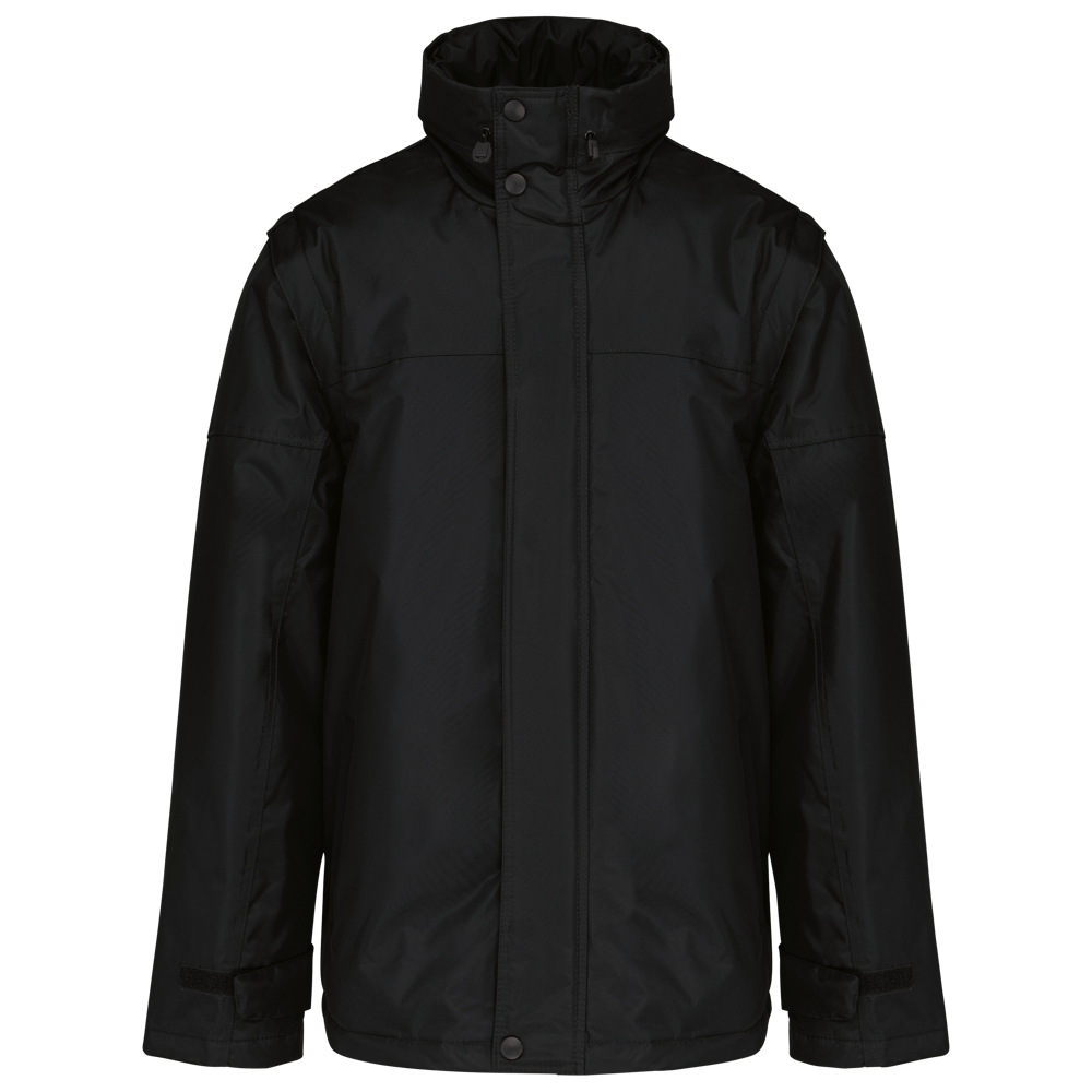 Außen: 100% Polyester PVC-Beschichtung innenseitig. Innenfutter: 100% Polyester und 100% Polyesterwattierung. Reißverschluss + Druckknopfleiste - abtrennbare Ärmel. Armabschluss mit Klettverschluss. 2 Seitentaschen. Kapuze im Kragen mit Reißverschluss. 2 Innentaschen mit Reißverschluss. 1 Handytasche. Kordelzug mit Stoppern am Bund. Zugang mittels Reißverschluss für leichtes Veredeln.