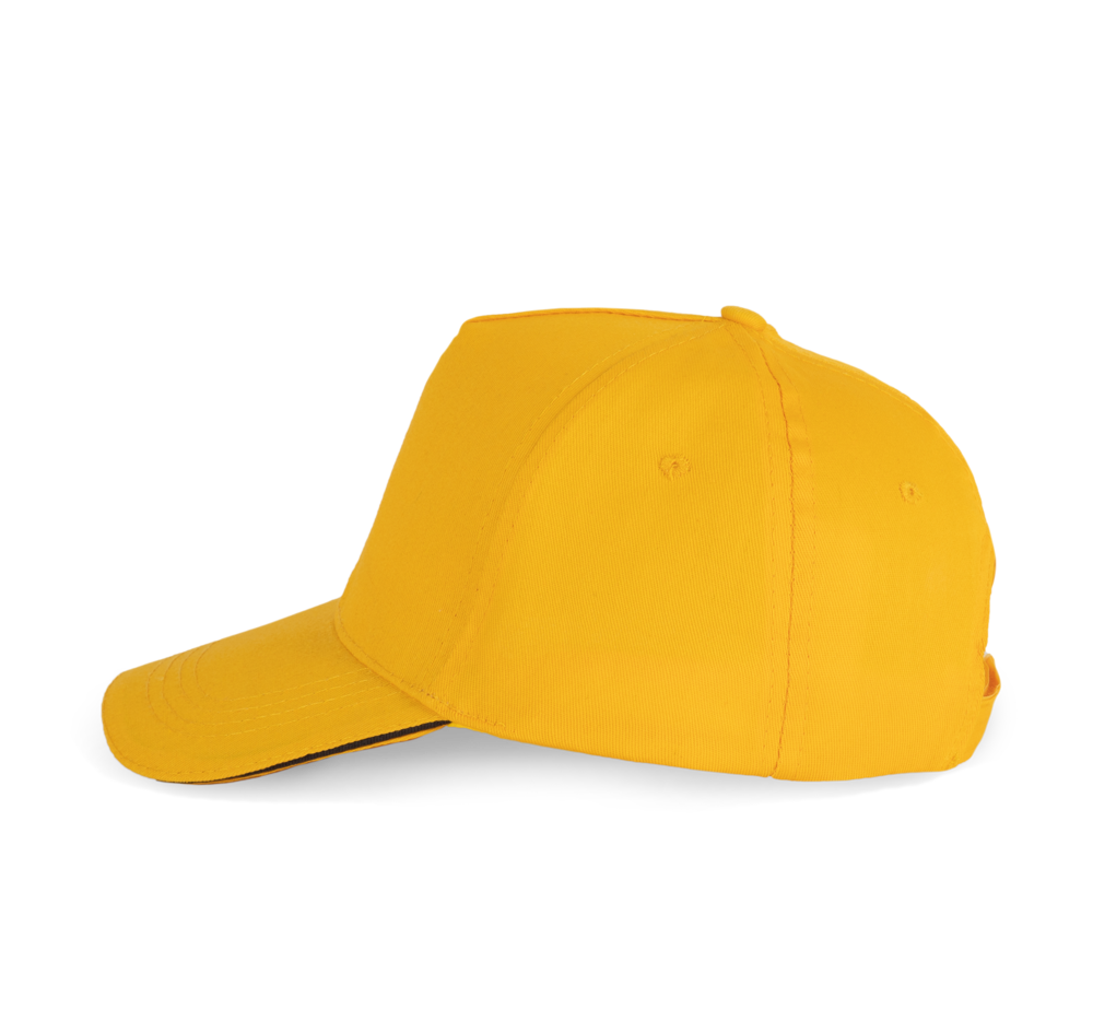 100% Baumwolltwill. 5-Panel-Kappe mit Schweißband aus Baumwolle. Größenverstellbar durch Kunststoffverschluss.