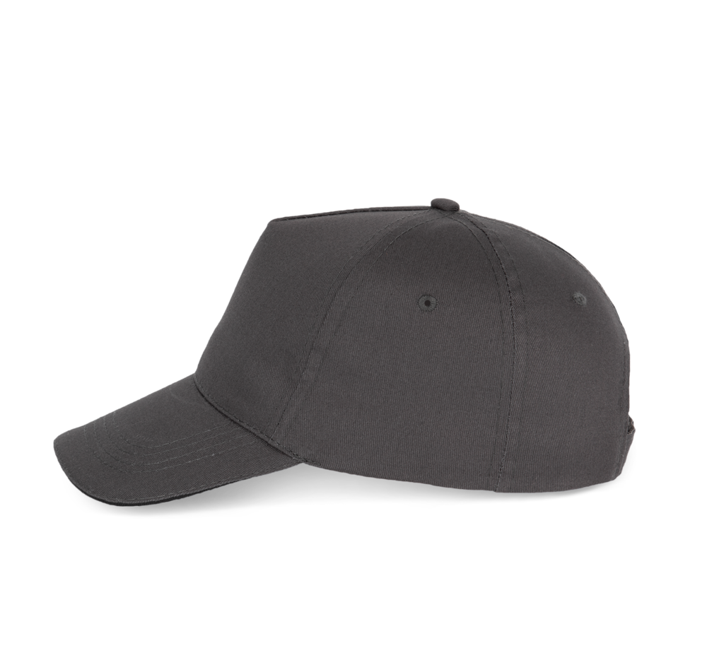 100% Baumwolltwill. 5-Panel-Kappe mit Schweißband aus Baumwolle. Größenverstellbar durch Kunststoffverschluss.