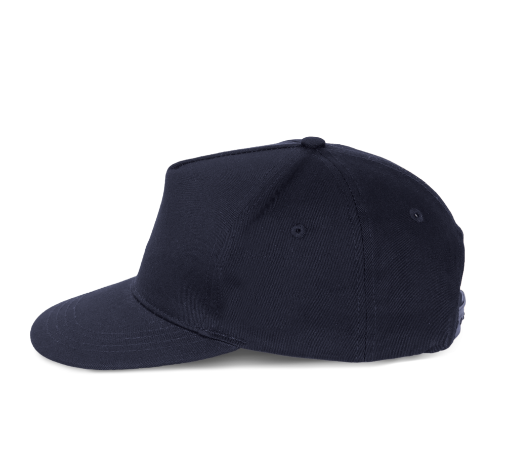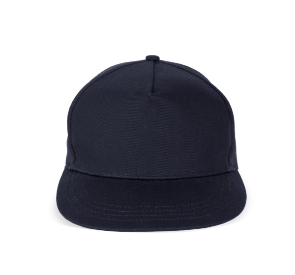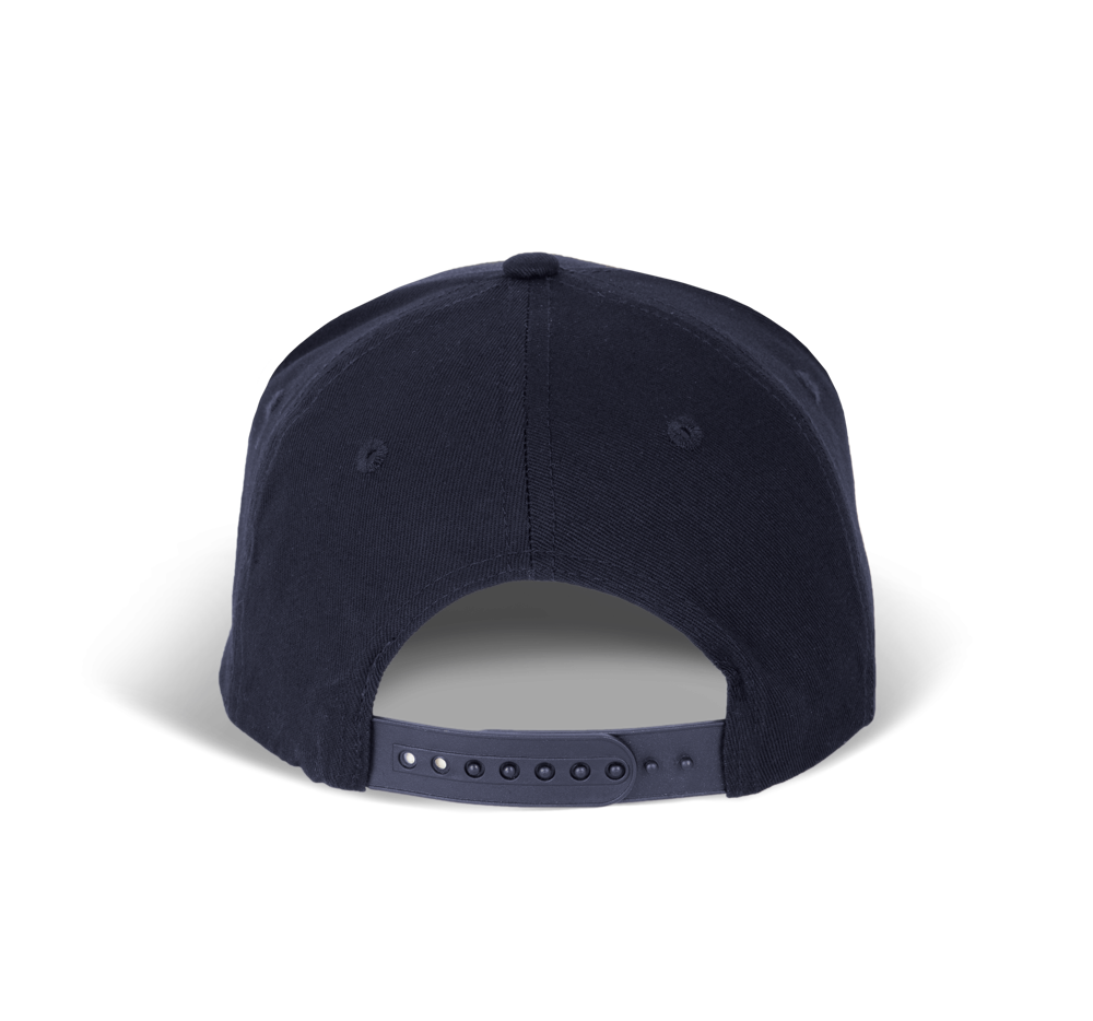 100 % Baumwollserge. 5 Panel-Kappe. Flacher Schirm. Kunststoffschnalle zur Weitenregulierung.