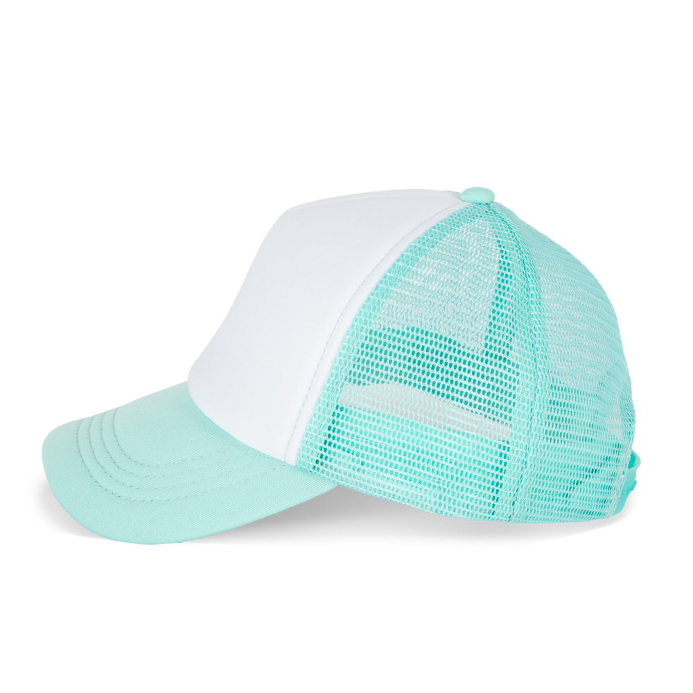 100 % Polyester mit Polyesternetz hinten. 5 Panels. Problemlose Veredelung auf vorderem Panel. Kunststoffschnalle zur Weitenregulierung. Kopfumfang: 53 cm.