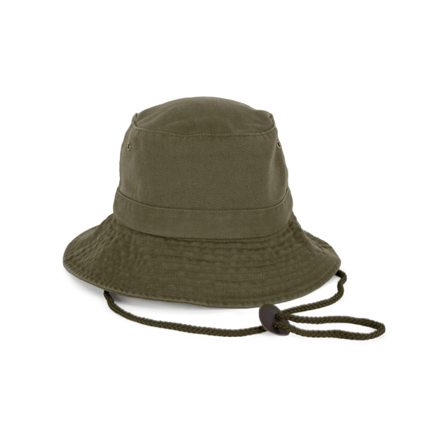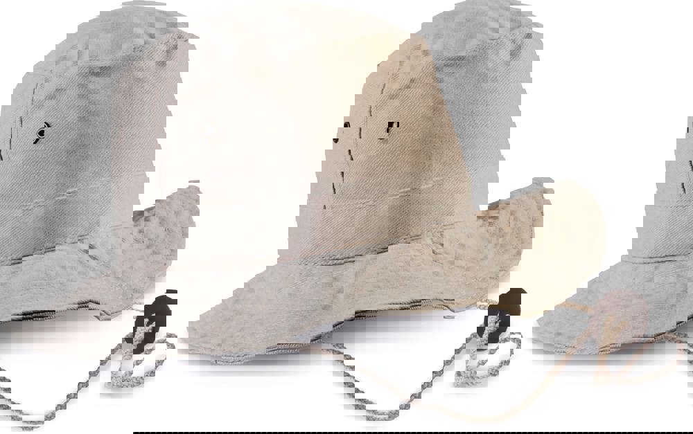 100% grob gebürstetes Baumwolltwill, fest und dicht. Doppelt gesteppter Rand. Krempe verstärkt. Schnur aus Leder, mit Stopper zum Einstellen. 4 Metall-Luftösen.