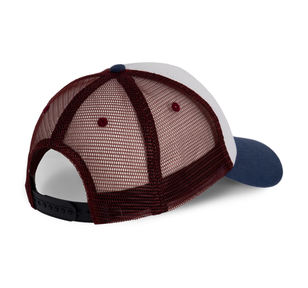 98% Bamwolle / 2% Polyester. 5-Panel-Kappe im Trucker-Stil. Frontpanel und Sonnenschutz-Visor aus Baumwollcanvas und Polyester-Netzstoff. Kunststoffriegel zur Weiteregulierung.