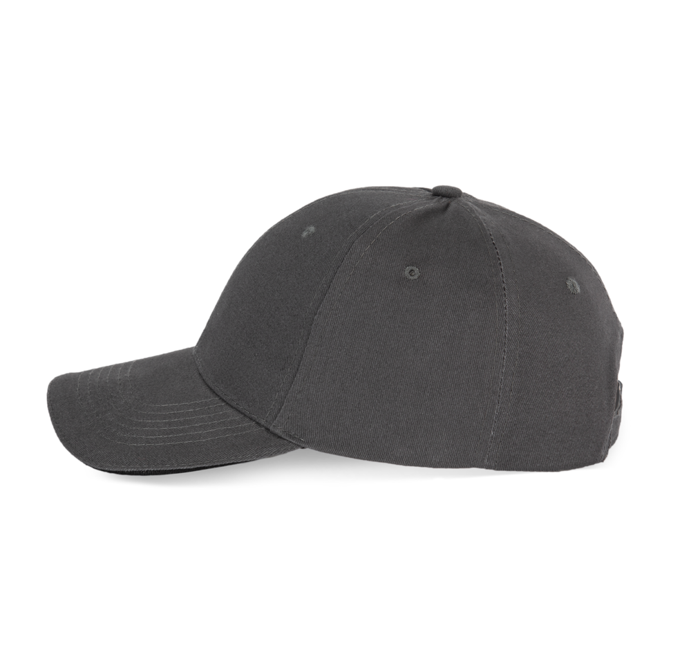 100 % Baumwollserge. 6 Panels. Kontrast-Sandwichschirm. Einstellbarer Verschluss mit Metallschnalle hinten.