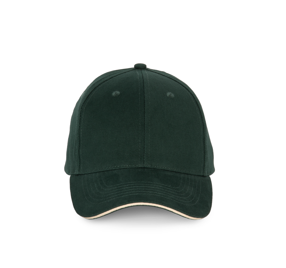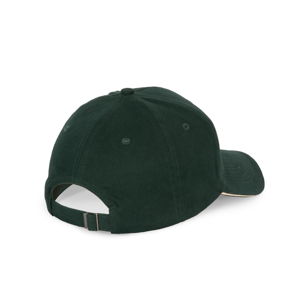 100 % Baumwolle. 6-Panel-Kappe mit Kontrast-Sandwichschirm. Über eine Metallschnalle verstellbarer Verschluss mit Schlaufe mit automatischer Bockierung.