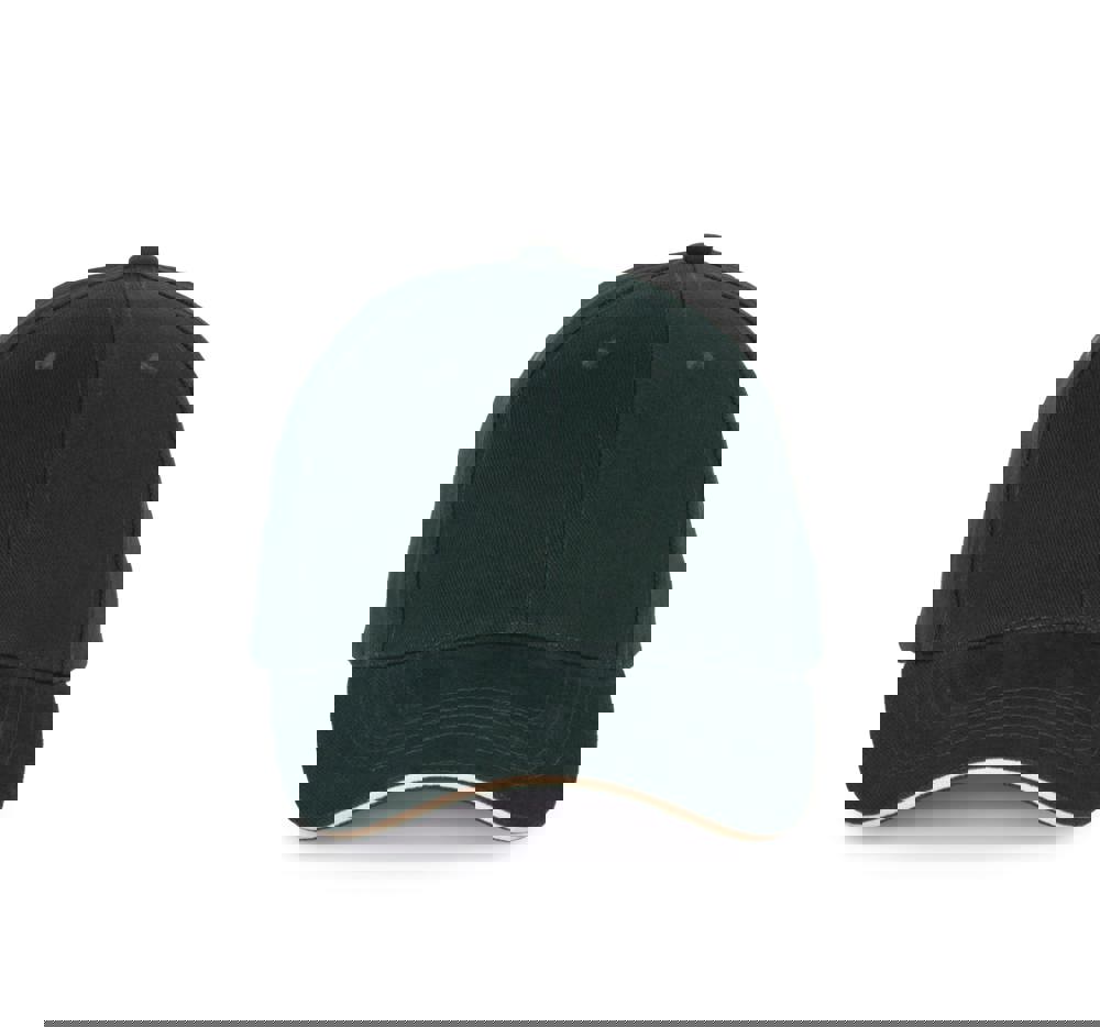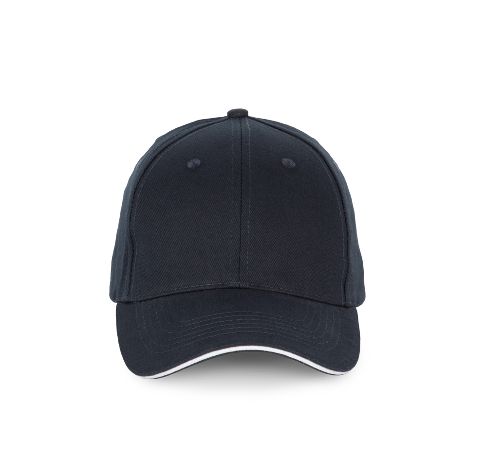100 % Baumwolle. 6-Panel-Kappe mit Kontrast-Sandwichschirm. Über eine Metallschnalle verstellbarer Verschluss mit Schlaufe mit automatischer Bockierung.