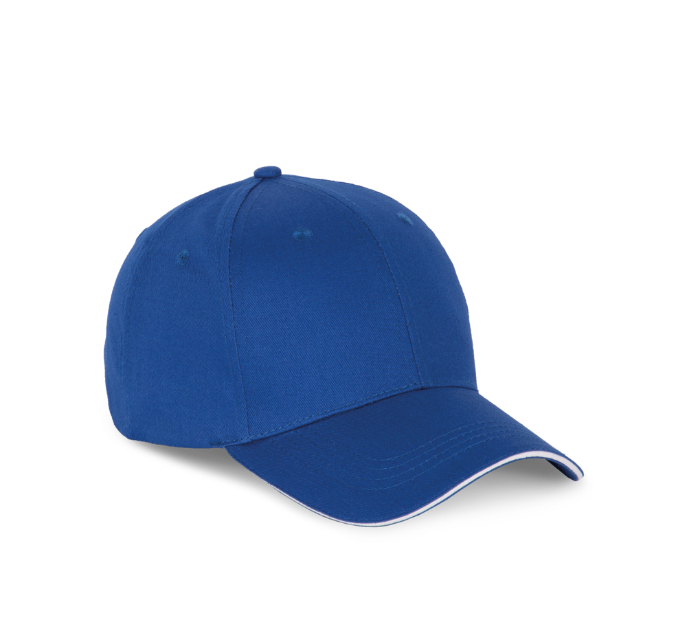 100 % Baumwolle. 6-Panel-Kappe mit Kontrast-Sandwichschirm. Über eine Metallschnalle verstellbarer Verschluss mit Schlaufe mit automatischer Bockierung.