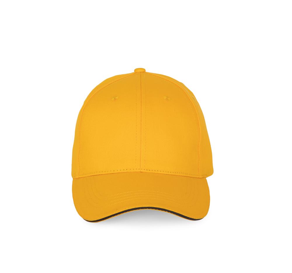 100 % Baumwolle. 6-Panel-Kappe mit Kontrast-Sandwichschirm. Über eine Metallschnalle verstellbarer Verschluss mit Schlaufe mit automatischer Bockierung.