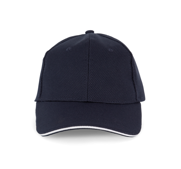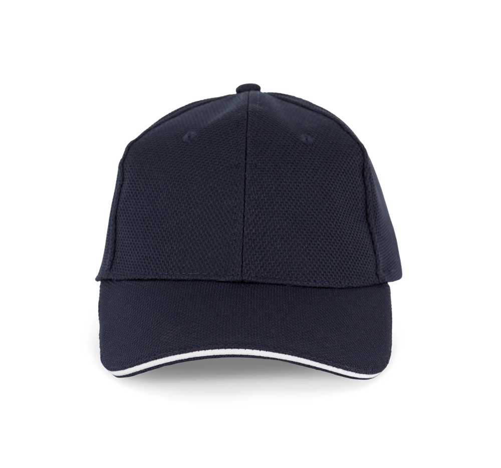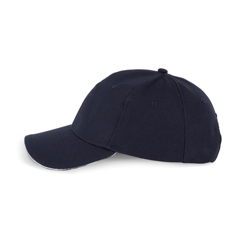 100% Polyester-Piqué. 6 Panels. Lüftungsösen. Zwischenstück in Kontrastfarbe. Stirnband innen gepolstert für optimalen Tragekomfort. Verstellbarer Klettverschluss.