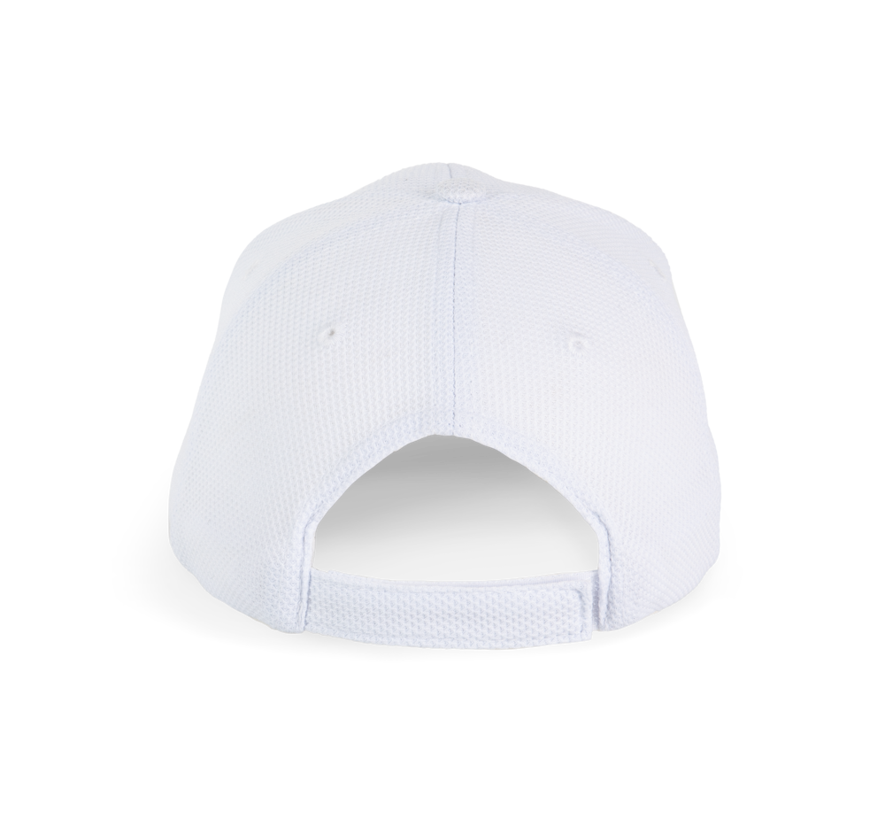 100% Polyester-Piqué. 6 Panels. Lüftungsösen. Zwischenstück in Kontrastfarbe. Stirnband innen gepolstert für optimalen Tragekomfort. Verstellbarer Klettverschluss.