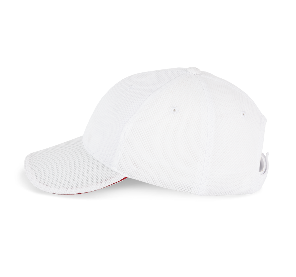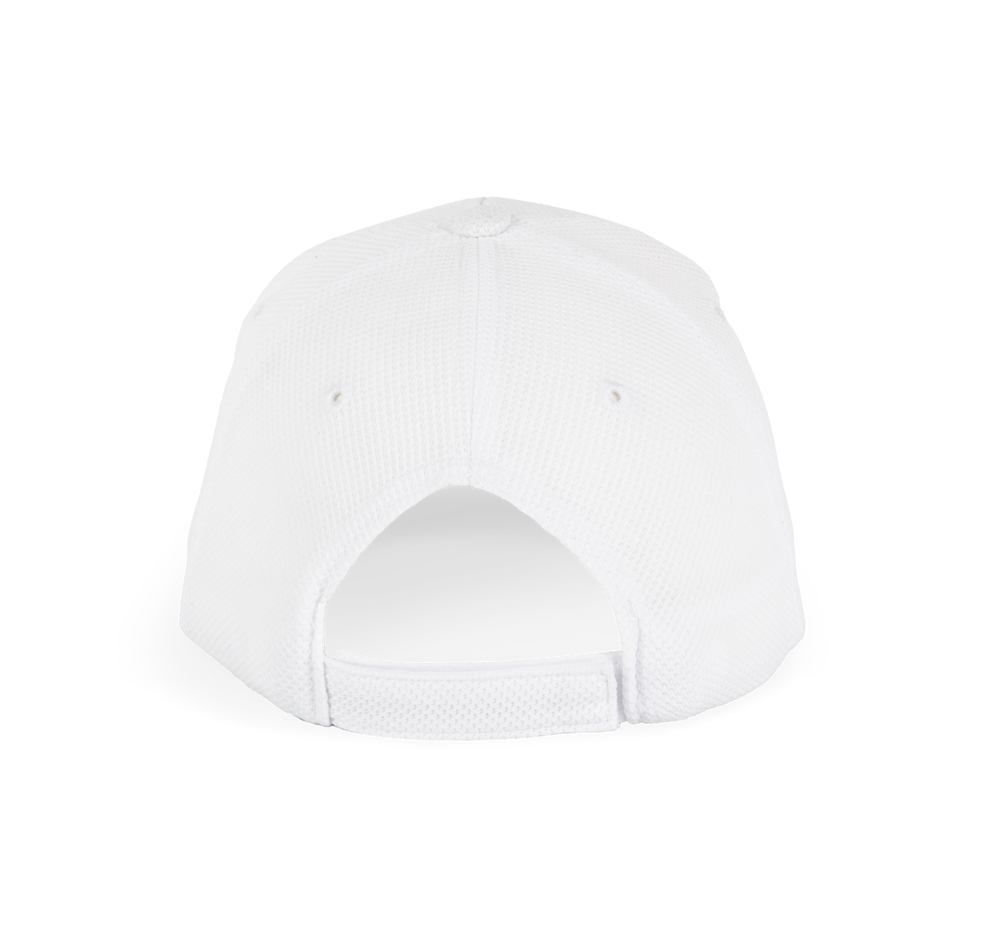 100% Polyester-Piqué. 6 Panels. Lüftungsösen. Zwischenstück in Kontrastfarbe. Stirnband innen gepolstert für optimalen Tragekomfort. Verstellbarer Klettverschluss.