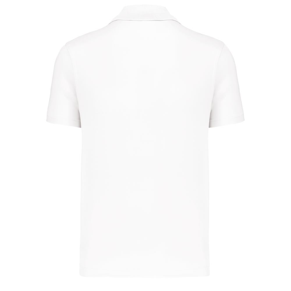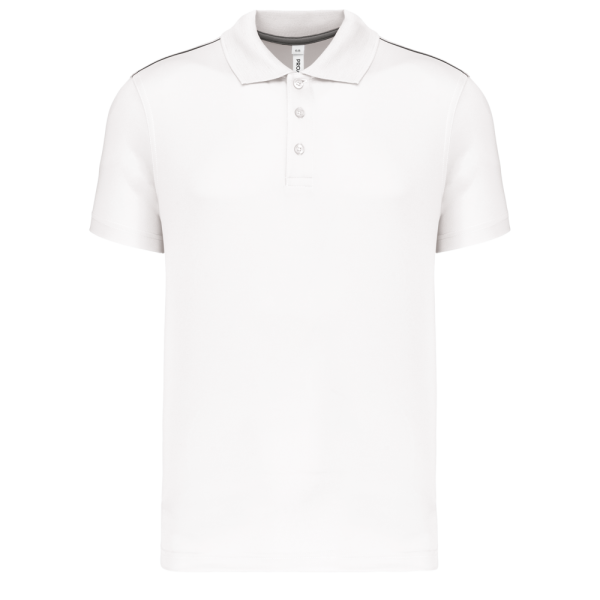 100 % Polyester-Interlock. Schnelltrocknendes Gewebe. Strickbündchen am Kragen. Knopfleiste mit 3 Knöpfen. Kontrastfarbenes Nackenband am Kragen sowie Seitenschlitze. Kontrastfarbene Paspel an den Schultern. Doppelnähte an Ärmelbündchen und unterem Saum.