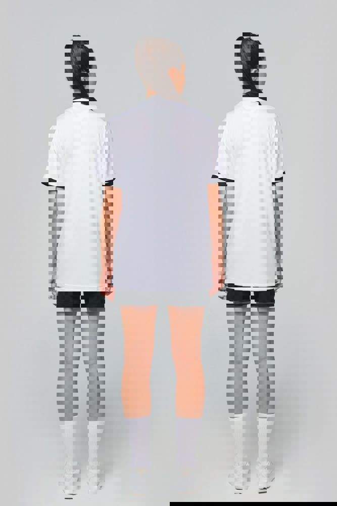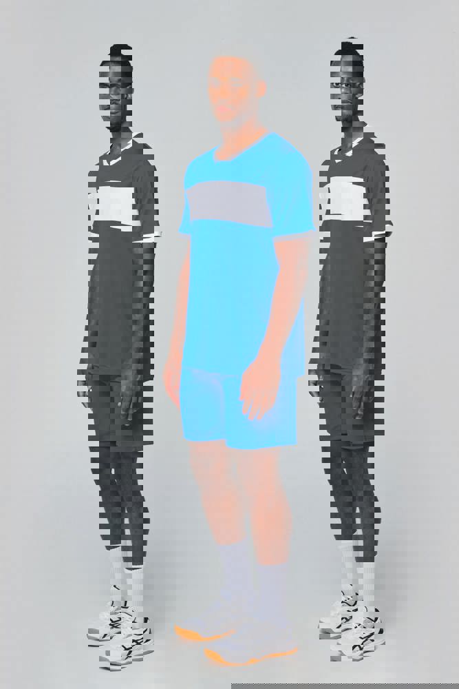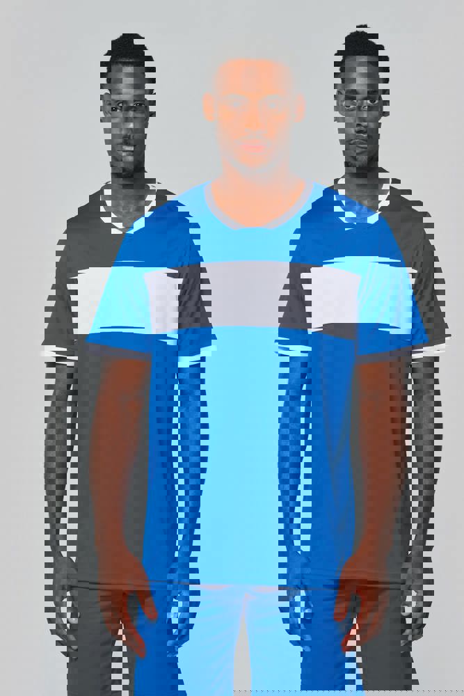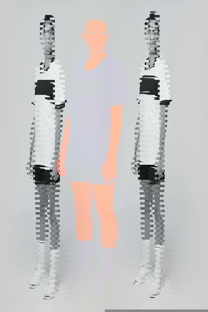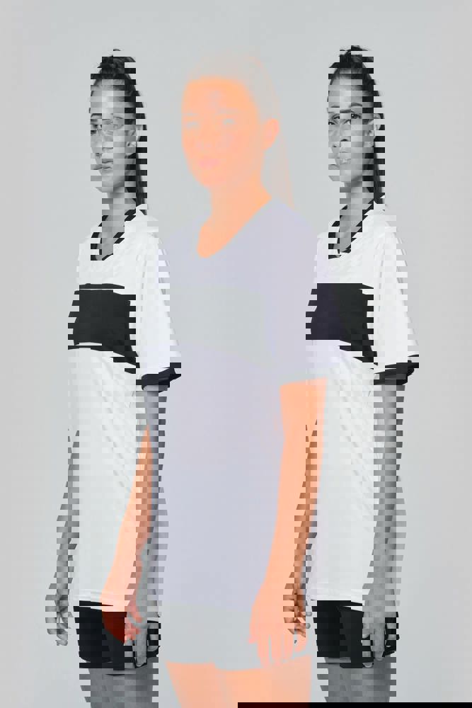 100 % Polyester-Interlock. V-Ausschnitt mit Nackenband. Set-in-Ärmel. Kontrastfarbene Einsätze an Brust, Hals und Ärmelbündchen.