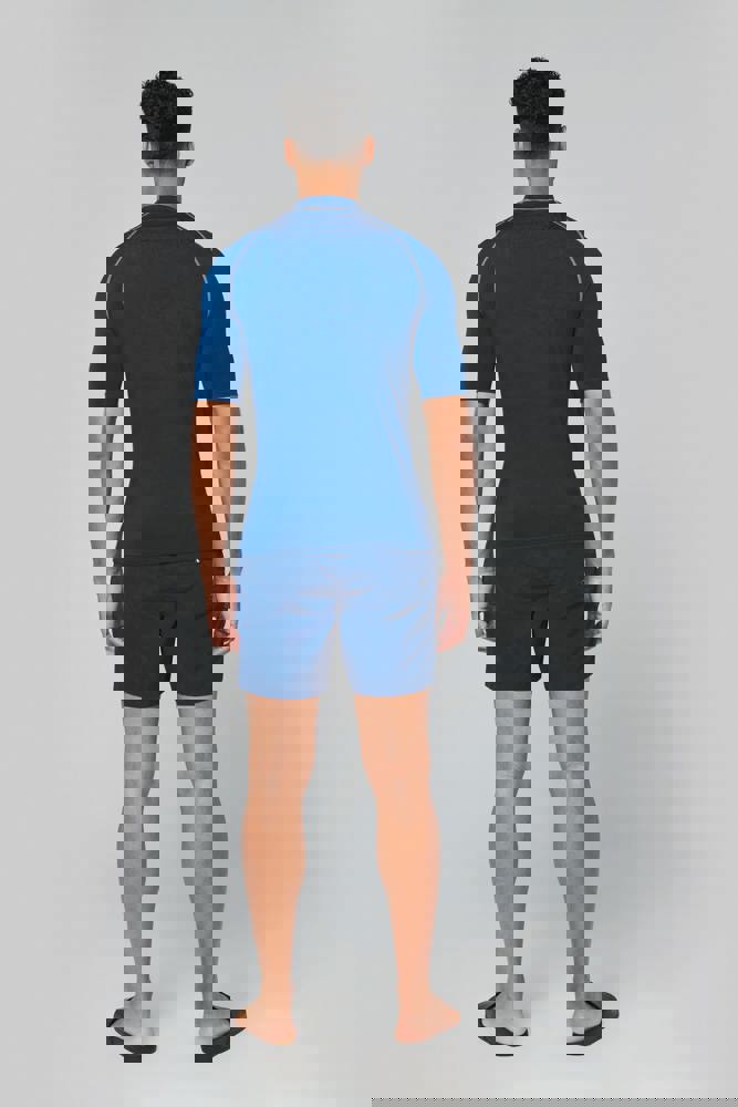 88 % Polyester / 12 % Elasthan. Dehnbarer Strick. UV 40+ Schutz ,entsprechend den Vorgaben der Norm EN13758-1&2. Kurze Ärmel. Hochgeschlossener Kragen. Sehr körpernaher Schnitt. Elastische Schnalle im Saum auf der Vorderseite zum Einführen der Kordel der Shorts, um auf diese Weise das T-Shirt zu stabilisieren. Kontrastfarbene Ziernähte. Doppelnähte an Ärmelbündchen und unterem Saum.